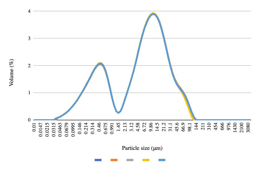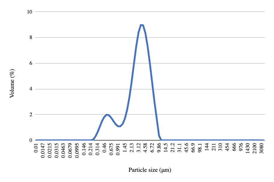 bottom solids were collected using a moisture analyzer. Particle size was measured using a light scattering method with three metrics: the mean particle size (denoted by Dx(50)), the volume containing 90% of the particle size or less (denoted by Dx(90)), and the De Broucker mean, representing the mean particle size weighted by the volume (denoted by Dx(4,3)) (Figure 1).3 Finally, the carton sediment was obtained by calculating the difference between the mass of the carton after the milk had been poured out and the mass once the carton was washed.