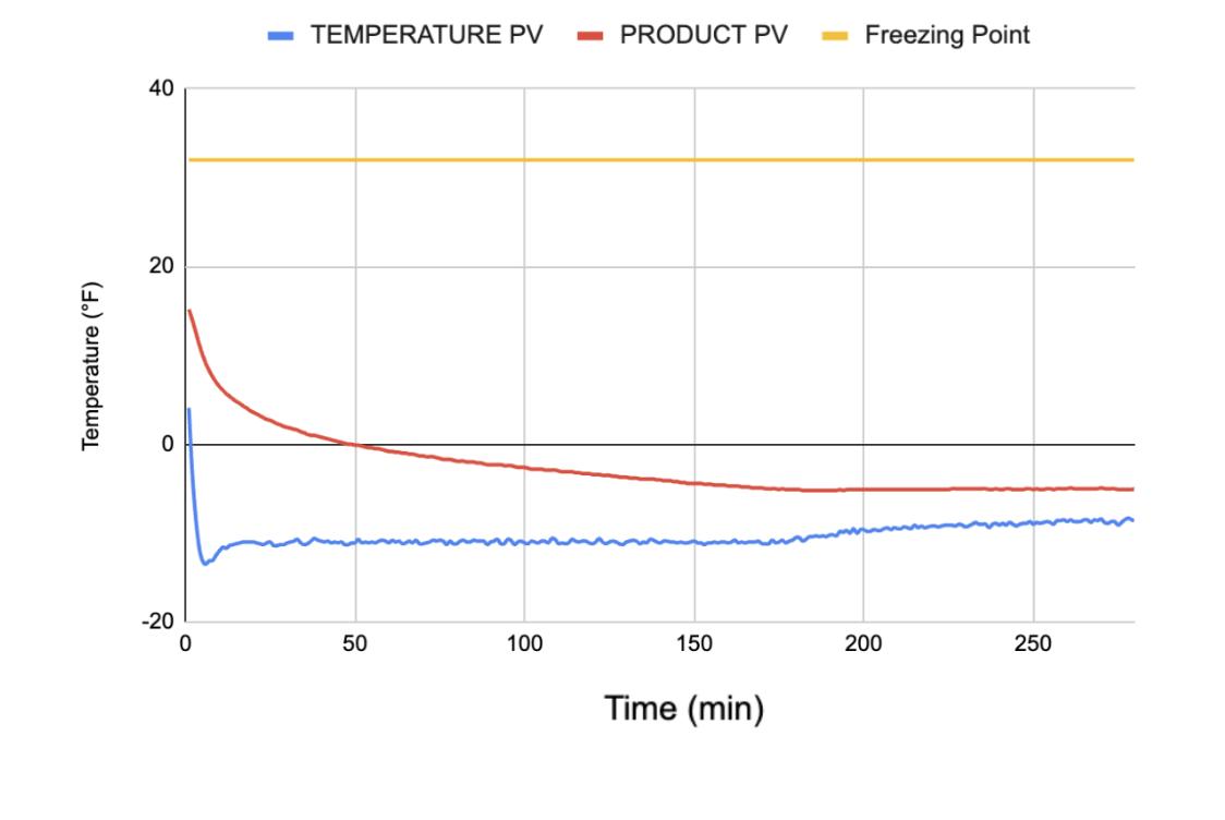 Figure 20 presents the relationship between the NDC’s temperature and the time spent in the freezing chamber across 280 minutes. The NDC was initially below the freezing point at 15.2°F, likely due to an error with the freezing probe. The product’s temperature declined steeply for the first 50 minutes, then began Declining less steeply, and eventually plateauing at around -5°F. The average freezing rate was 0.07°F/minute.