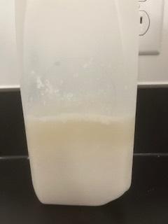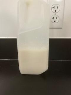 Consistent with the two previous packaging types, more separation appeared in the ½ gallon milk bottles thawed in the freezing chamber than in the bottles thawed at room temperature (Figures 16-17). Notably, there was still visible separation in the bottle thawed at room temperature, particularly apparent with the particle clusters presented from a bird’s eye view (Figure 17B). Both samples appeared fully homogenized after shaken well (Figures 16B, 17C, 17D).