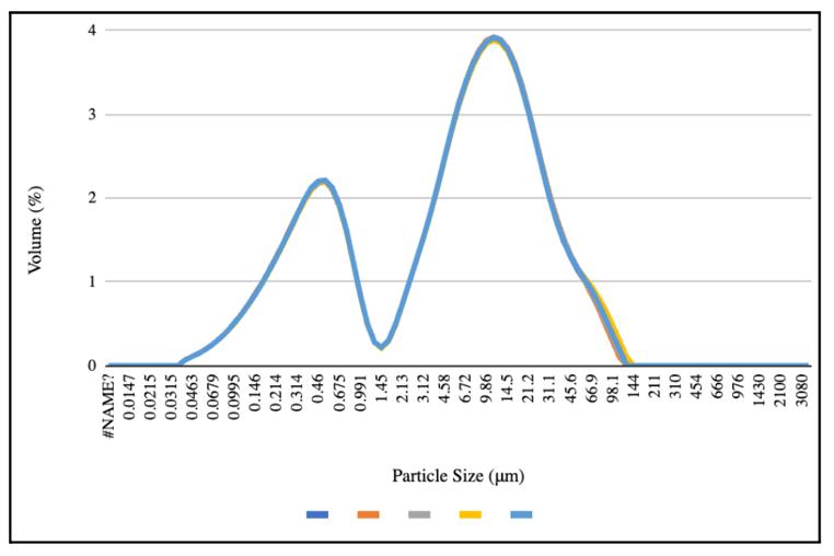 The particle size graphs reach similar peaks from pre-freeze to post-freeze in the 50 mL centrifuge tubes and 8 oz bottles, with 2.2% of the volume containing 0.52 μm at the first peak and 9.86% of the volume containing 11.2 μm at the second peak (Figures 4-6). More deviation appears between the pre-freeze and post-freeze particle size graphs for the ½ gallon bottles (Figures 7-8). While the pre-freeze graph hits two peaks at 0.405 μm and 11.2 μm, containing 2.6% and 3.04% of the volume, respectively, the postfreeze graph hit one small peak at 0.594 μm containing 1.53% of the volume and a larger peak at 11.2 μm containing 4.18% of the volume (Figures 7-8).