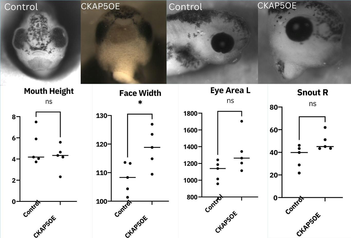 There are a host of genes with diverse functions within the cell, yet they are all speculated to play a role in cranial crest cell migration, and therefore the formation of the brain and facial structure. After performing our experiments, the embryos with overexpressed CKAP5 showed trends of larger eye areas, larger face width, larger midface area, and mouths that are shorter, wider, and have larger areas. The snout lengths showed inconsistent trends, with the left side of the snout being shorter than the control, and the right side of the snout being longer. However, more experiments involving CKAP5’s impact on facial morphology must be completed to determine if it is a factor that causes craniofacial disorders. There have also been studies conducted involving the knockdown of CKAP5, in which morphilio was injected into Xenopus embryos in order to block the expression of this gene, which also showed promising results and trends. But in addition to CKAP5, other genes that express themselves along the neural tube during embryonic development must be investigated to determine if they cause craniofacial disorders. The process is complex in that both knockdown and overexpression must be looked into.