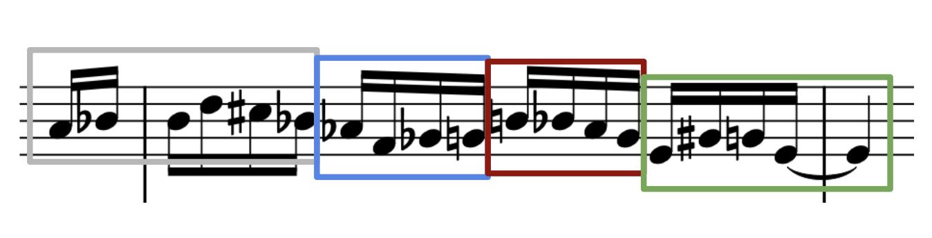 In this passage, Corea employs a much more standard and predictable strategy for playing outside of the key. He starts by simply playing a fragment of the melody starting on B♮, then repeating it down a half step on B♭. In the third measure, he plays a slightly modified version of the phrase starting on F. While the first and second repetitions have a forte number of 4-26, the final iteration is 4-23; while a D♭ is expected, an E♭ is present instead. This difference could have been a mistake; however, it is more likely that Corea intentionally modified the pc-set for the sake of variation.