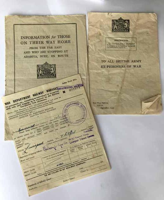Further paperwork included the booklet ‘To all British Army Ex-Prisoners of War’. This twelve page instruction/advice booklet, issued by the War Office, started with the headings Status, Rank, Service and Security. Another heading ‘Arrival in England’ covered disembarkation: the opportunity to send a telegram to their family confirming they were now on British soil, the issue of ration cards, advice on pay and accounts as well as leave: they were given forty two days repatriation leave.