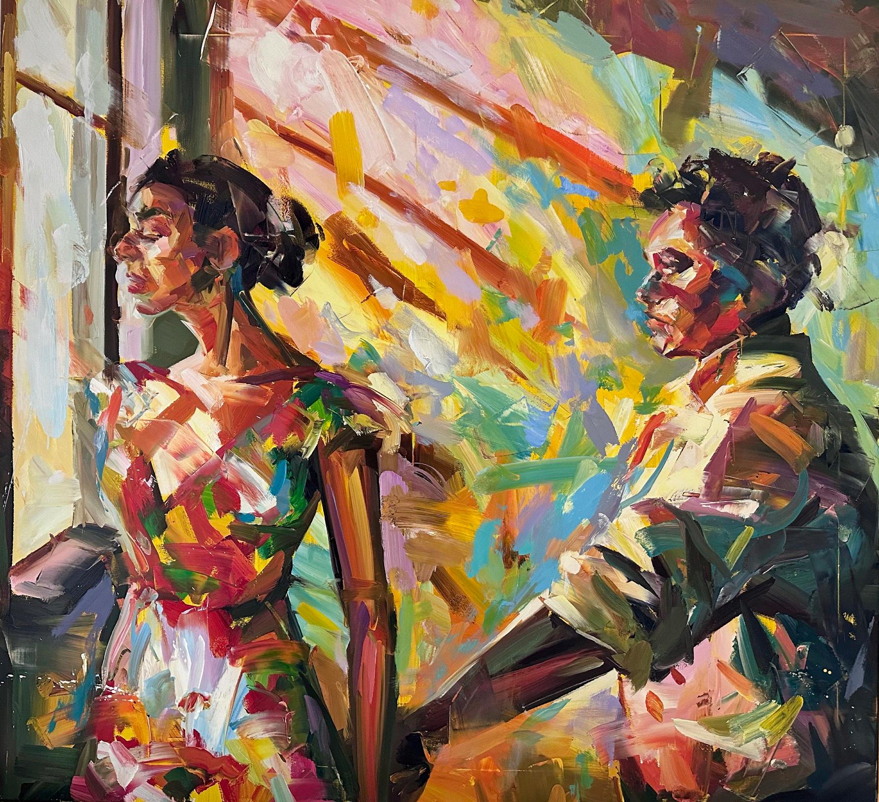A conversation begins with silence. History leans back, listening for once. The women speak; colour rearranges itself around their voices. What was fixed starts to move. Admiration learns accountability.