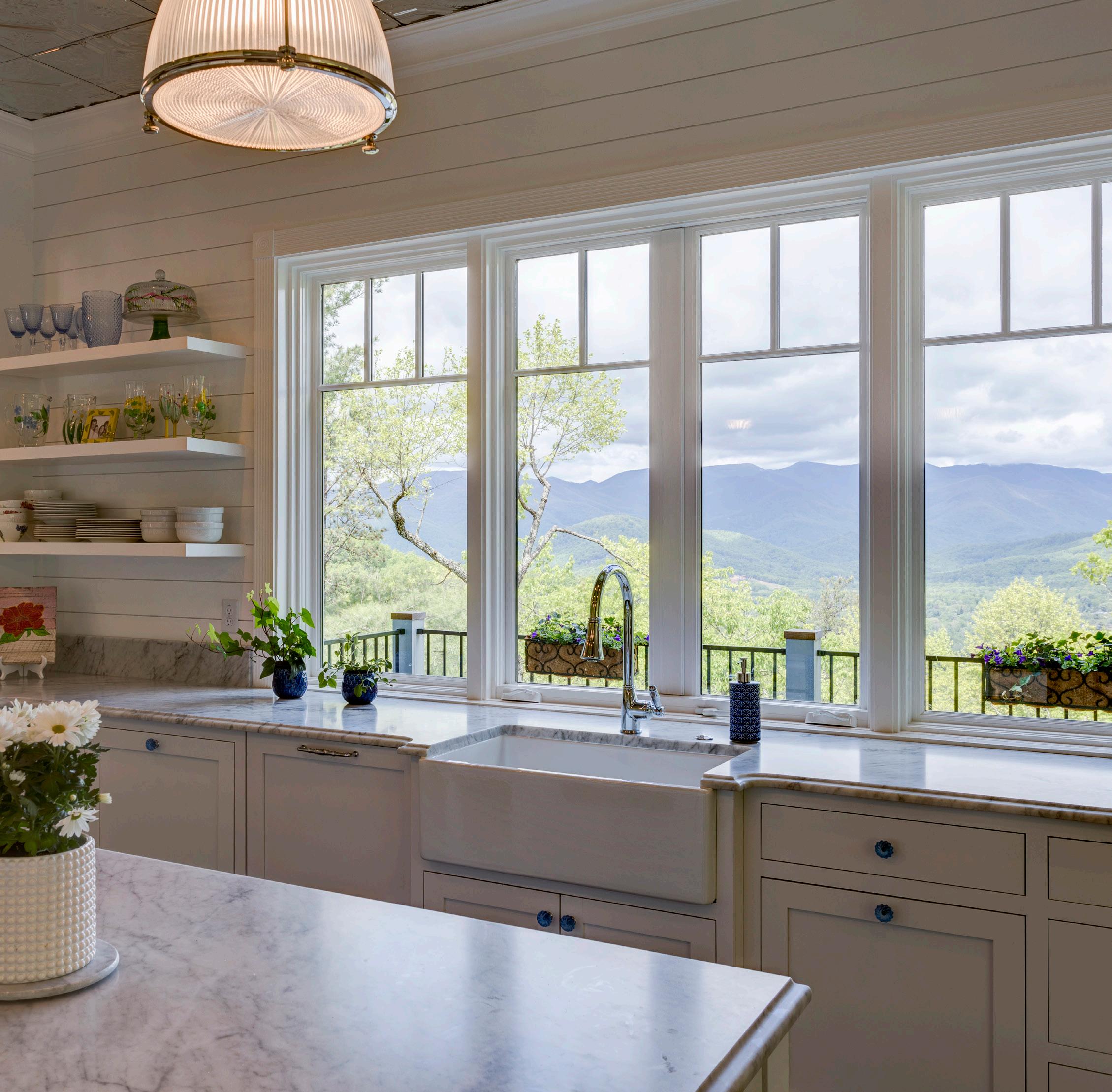 This home was built to fully embrace its exceptional ABOVE mountain view. The kitchen adjoins one of the outdoor living spaces, and the view is framed in the windows over the sink.