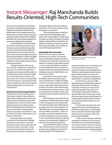 approach has led to a vibrant and growing nano community at ASME.” To expand that community even further, he recently helped launch ASME’s new Nano Educational Series Podcasts, featuring video interviews of leading nanotechnology experts discussing challenges and opportunities in nanodevices and applications. One of his former supervisors, ASME Managing Director of Global Alliances Michael Michaud, lauds Manchanda for his ability to build results-oriented communities of smart people with great ideas. “Raj is able to connect the ideas and the people to ASME and align their efforts with a business plan and the resources to get things done,” says Michaud. “He is always assessing opportunities and looking for an opening to create something new and provide value.” For Manchanda, every day brings more opportunities to create and energize groups of high-tech problem-solvers, and to get them the print and online information they need to advance solutions to energy and other highpriority societal challenges. “I’m like an instant messenger, absorbing messages from the technical community and eventually connecting technology developers with end-users,” he says. “We are at a crossroads now, and engineers and scientists are well positioned to create solutions to societal challenges.” —Mark Dwortzan
