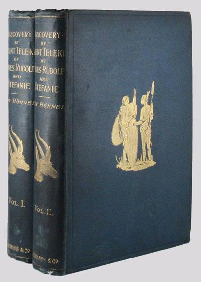 18 Von Höhnel, Ludwig. DISCOVERY OF LAKES RUDOLF AND STEFANIE: A NARRATIVE OF COUNT SAMUEL TELEKI’S EXPLORING AND HUNTING EXPEDITION IN EAST EQUATORIAL AFRICA IN 1887 & 1888. (London: Longmans, Green & Co., 1894) 2 volumes. First Edition. Scarcest variant, bound in the blue decorated cloth. With 179 original illustrations including 36 wood-engraved full page plates and 5 coloured maps on two large folding map sheets. Tall 8vo, publisher’s original pale blue cloth lettered in gilt and with gilt pictorial designs of African tribesmen and gazelles on top covers and spines, edges untrimmed. xx, 435; xii, 397 pp. A very handsome and pleasing set of this scarce first edition in the scarcest binding colour and with a few old and occasional but small and discreet library markings. The set was part of a reference library and not a lending library, thus remains in very pleasing, as fine condition. Shelf numbers in the lower quadrant of the spines sometime discreetly coloured over in pigment matching the binding colour, only light aging to the volumes. A very attractive pair.