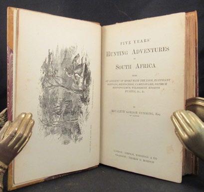 3 Cumming, Roualeyn Gordon. FIVE YEARS’ HUNTING ADVENTURES IN SOUTH AFRICA being an account of sport with lion, elephant, buffalo, rhinoceros, camelopard, ostrich, hippopotamus, wildebeast, koodoo, hyaena, &c., &c. (London: Simpkin, Marshall and Co., [n.d.]) First Edition. Illustrated with black and white drawings. 8vo, handsomely bound in threequarter tan calf over marbled paper covered boards, the spine with raised bands blind ruled, the compartments with gilt tooled devices showing various animals, maroon morocco gilt lettered and gilt ruled. 349 pp. A handsome and well preserved copy, the binding strong and tight and without wear, still almost as pristine, the textblock mellowed a bit by time.
