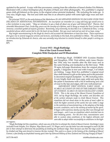 est regions. “Hugh Ruttledge led this expedition, which was one of the first to attempt the climb of Mount Everest. Ruttledge’s team included Frank Smythe, Eric Shipton, Wyn Harris and L. R. Wager, and it was the latter two who managed to reach 28,200 feet in their attempt to determine the possibility of climbing the northeast ridge. Their decision was that the ridge could not be climbed and they were forced to traverse the face instead. This work is a classic in the history of the climbing of Mount Everest, a feat finally accomplished twenty years later by Edmund Hillary of New Zealand and Tenzing Norgay of Nepal.” (617) 536-4433