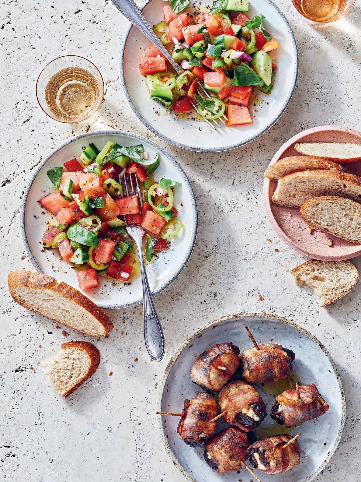 Tomaten • 1 kleine Bio-Salatgurke • 400 g Was sermelone • 1 rote Spitzpaprika • 2 grüne Spitz paprika • 1 rote Zwiebel • 6 Stiele Basilikum