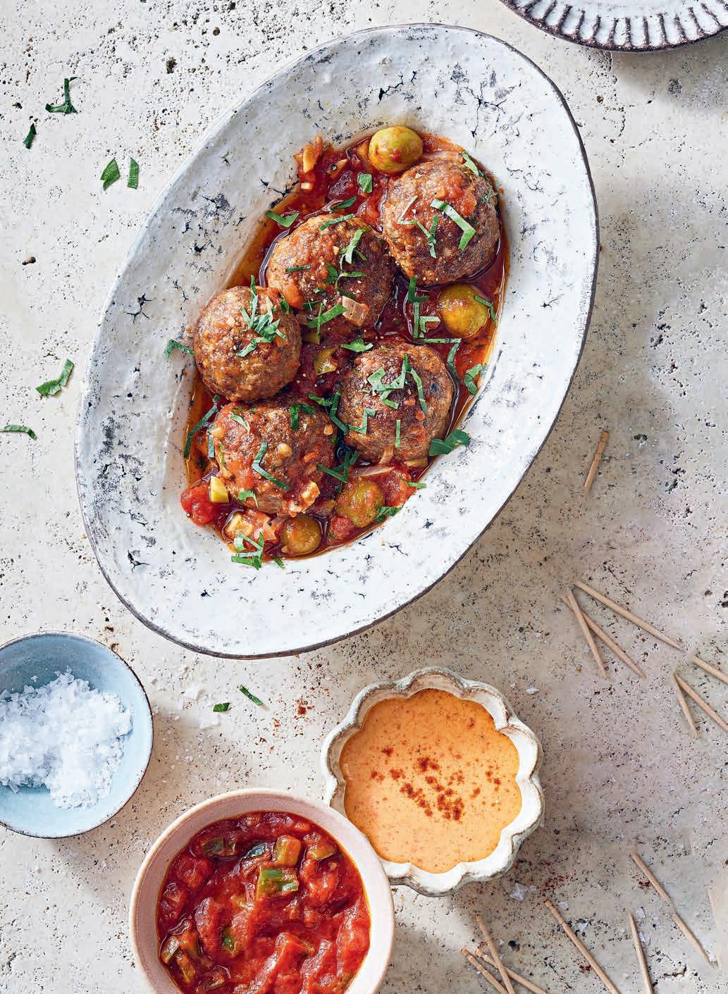 3 3 EL Öl in einer Pfanne erhitzen und die Bällchen darin 5 Minuten rundherum scharf anbraten. Bällchen in der Tomatensauce bei milder Hitze 8–10 Minuten gar ziehen lassen. Mit der restlichen Petersilie bestreuen und servieren.