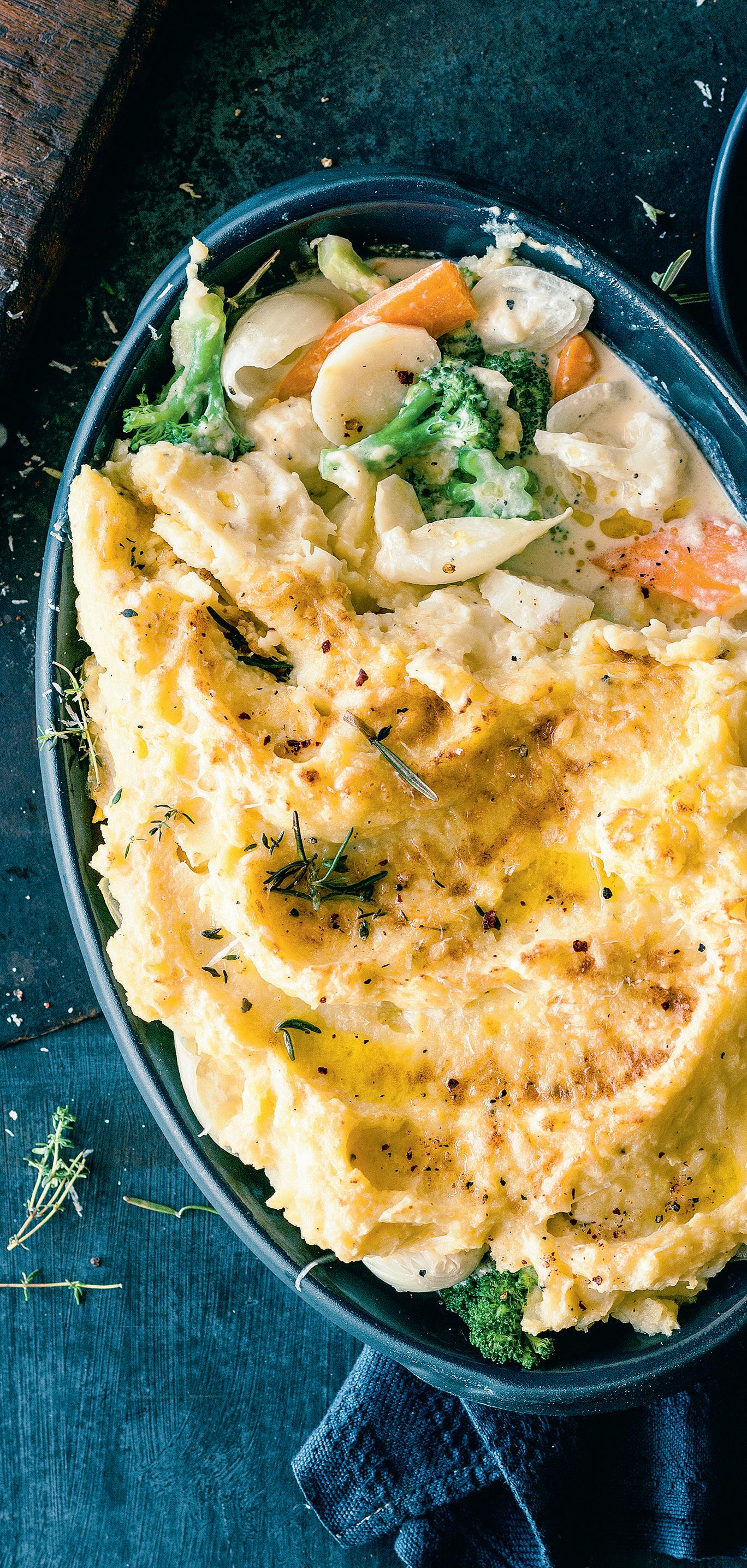 4 Den Backofen auf 190 Grad Ober- und Unterhitze (Umluft 170) vorheizen. Eine Auflaufform (ca. 30 x 20 cm) fetten. Das vorbereitete Gemüse darin verteilen, mit der Parme sansauce übergießen und mit dem Kartoffelstampf bedecken. Die Form auf ein Backblech stellen. Den Auflauf auf der mittleren Schiene ca. 40 Minuten backen. Anschließend herausnehmen und servieren.