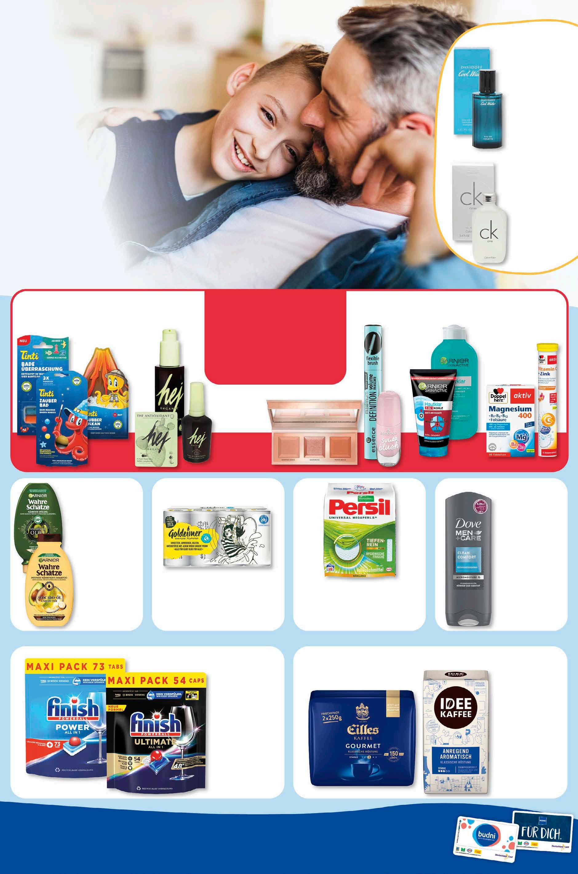 Gültig vom 15.05. bis 20.05.2023 KW 20 Persil Waschmittel versch. Sorten 18 WL 1 WL = 0,25 4,44 -31% UVP 6,39 Finish Spülmaschinen-Tabs versch. Sorten 54/73 WL 1 WL = 0,14/0,11 7,77 -22% UVP 9,99 Goldeimer Recycling Toilettenpapier 3-lagig 8x 150 Blatt 3, 33 -17% UVP 3,99 SKIN ACTIVE 20% rabatt auf alle artikel von Garnier Wahre Schätze Shampoo oder Spülung versch. Sorten 250/200 ml 1 l = 7,96/9,95 1,99 -29% UVP 2,79 Calvin Klein One Eau de Toilette 100 ml 24,99 -50% UVP 50,00 Davidoff Cool Water Man Eau de Toilette 40 ml 19,99 -26% UVP 26,99 am 18.05. ist vatertag Dove Duschgel versch. Sorten 250 ml 1 l = 6,64 1,66 -28% UVP 2,29 Solange der Vorrat reicht. Irrtümer vorbehalten. Abgabe in haushaltsüblichen Mengen. Idee oder Eilles Kaffee versch. Sorten 500 g 1 kg = 8,88 4,44 -43% UVP 7,79 Noch keine DeutschlandCard? Dann schnell in der App, auf budni.de oder in Deinem budni registrieren. punkten und sparen