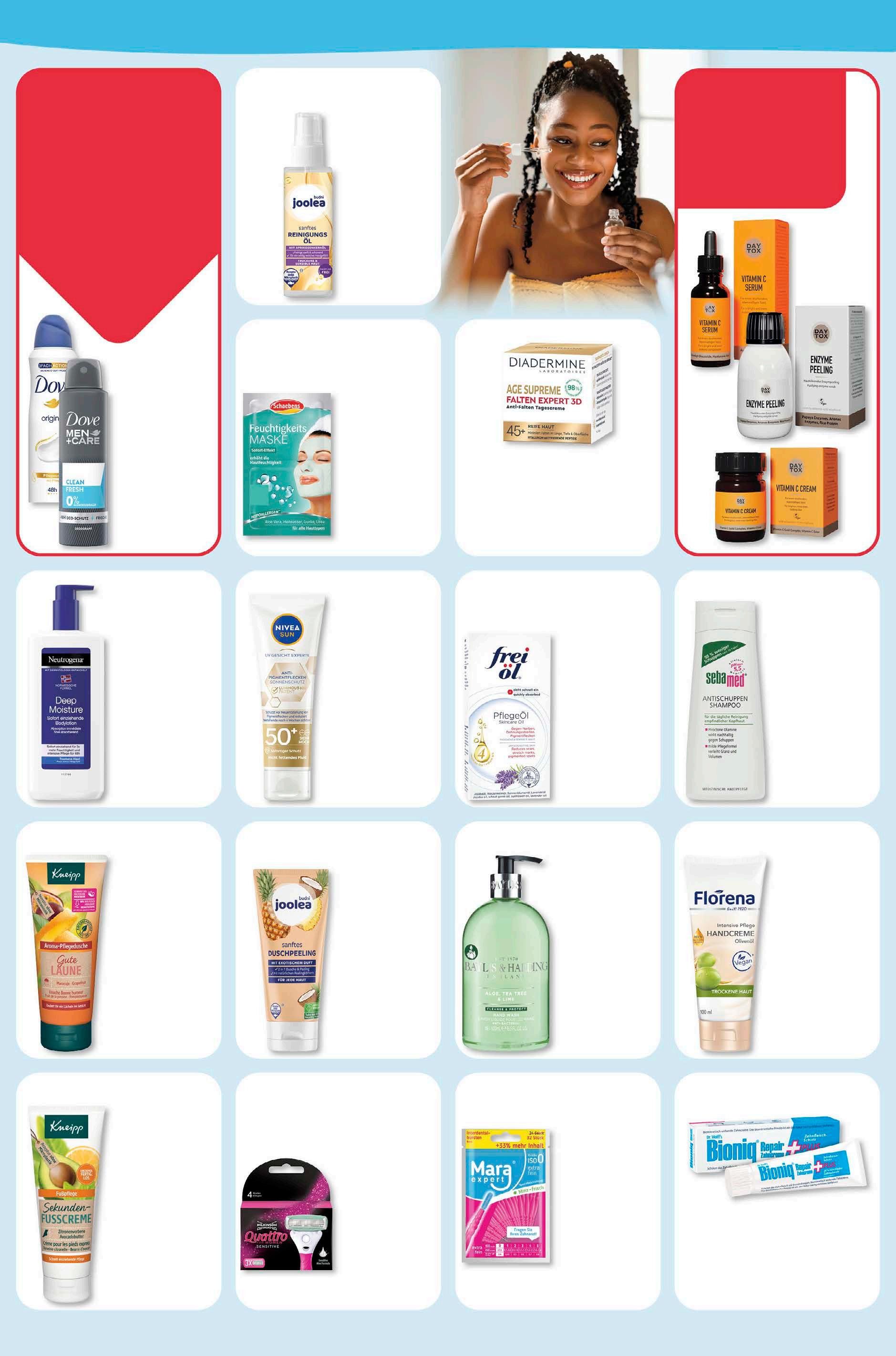 Abgabe in haushaltsüblichen Mengen. Günstigster Preis der letzten 30 Tage: Blüte-Zeit Duschgel 1,79, Blüte-Zeit Handcreme 1,77. ‡ Gleichzeitig günstigster Gesamtpreis der letzten 30 Tage. pflege & frische Nivea Sun Anti-Pigmentflecken Sonnenschutz LF50+ 40 ml 1 l = 374,75 14,99 -17% UVP 17,99 Neutrogena Körperlotion versch. Sorten 400 ml 1 l = 9,98 3,99 -20% UVP 4,99 Diadermine Age Supreme Expert 3D Tagescreme 50 ml 1 l = 99,00 4,95 -17% UVP 5,99 Sebamed Shampoo versch. Sorten 200 ml 1 l = 14,95 2,99 -25% UVP 3,99 Schaebens Gesichtsmaske versch. Sorten 10 ml 1 l = 49,00 0,49 -18% UVP 0,60 Bioniq Repair-Zahncreme Plus 75 ml 1 l = 71,87 5, 39 -10% UVP 5,99 Kneipp Sekunden Fußcreme versch. Sorten 75 ml 1 l = 39,87 2,99 -14% UVP 3,49 Frei Öl Pflegeöl 125 ml 1 l = 79,92 9,99 -27% UVP 13,70 Florena Handcreme versch. Sorten 100 ml 1 l = 11,10 1,11 -26% UVP 1,49 Kneipp Duschgel versch. Sorten 200 ml 1 l = 13,45 2,69 -33% UVP 3,99 Baylis & Harding Handseife versch. Sorten 500 ml 1 l = 4,78 2, 39 -20% UVP 2,99 Mara Expert Interdentalbürsten versch. Sorten Packung 2,99 -30% UVP 4,29 Joolea Duschpeeling vegan 200 ml 1 l = 6,45 1,29 -13% 1,49 ‡ budni marke dienstag happy deal am 1,77 UVP 2,49 -29% 1 l = 11,80 Dove Deo Spray versch. Sorten 150 ml 1 l = 13,00 1,95 -22% UVP 2,49 Joolea Reinigungsöl vegan 100 ml 1 l = 19,90 1,99 -19% 2,45 budni marke Wilkinson Quattro for Women Sensitive Rasierklingen 3 Stück 6,66 -17% UVP 7,99 20% rabatt auf alle artikel von daytox.