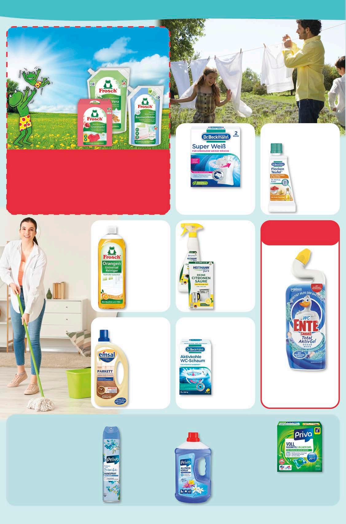 waschen & haushalt Abgabe in haushaltsüblichen Mengen. Frosch Universal Reiniger versch. Sorten vegan 750 ml 1 l = 2,52 1,89 -17% UVP 2,29 Dr. Beckmann Fleckenteufel versch. Sorten 50 ml 1 l = 39,80 1,99 -13% UVP 2,29 Emsal Boden-Pflege versch. Sorten 1 Liter 3,99 -27% UVP 5,49 Heitmann Citronensäure Spray oder Pulver 500 ml/350 g 1 l/kg = 5,98/8,54 2,99 -19% UVP 3,69 WC-Ente Total Aktiv Gel1 versch. Sorten 750 ml 1 l = 2,25 1,69 -32% UVP 2,49 1 Biozidprodukte vorsichtig verwenden. Vor Gebrauch stets Etikett und Produktinformation lesen. 1,49 aktion Dr. Beckmann Super Weiß 80 g 1 kg = 18,63 Dr. Beckmann Aktivkohle WC-Schaum 3x 100 g 1 kg = 8,63 2,59 aktion