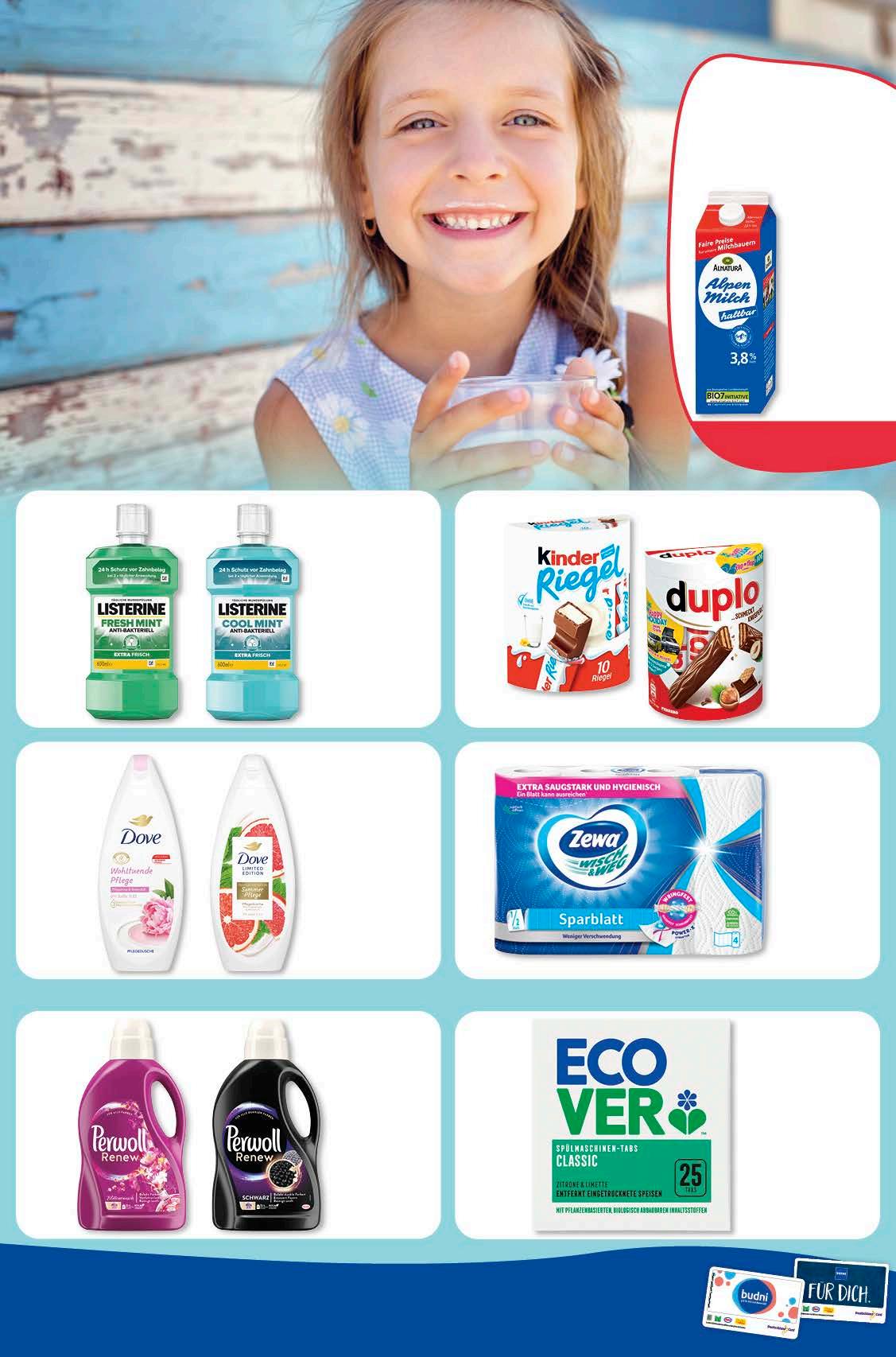 Gültig vom 03.07. bis 08.07.2023 Perwoll Waschmittel versch. Sorten 25 WL 1 WL = 0,16 3,99 -20% UVP 4,99 Duplo oder Kinder Riegel versch. Sorten 182/10x 21 g 1 kg = 9,84/8,52 1,79 -31% UVP 2,59 Mehr attraktive AlnaturaAngebote auf Seite 6. KW 27 Noch keine DeutschlandCard? Dann schnell in der App, auf budni.de oder in Deinem budni registrieren. punkten und sparen Listerine Cool oder Fresh Mint Mundspülung versch. Sorten 600 ml 1 l = 5,82 3,49 -22% UVP 4,49 Zewa Wisch & Weg Küchenpapier Sparblatt 4x 74 Blatt 2,79 -15% UVP 3,29 Alnatura H-Milch 1,5 oder 3,8% 1 Liter 1,29 -13% UVP 1,49 Ecover Spülmaschinen-Tabs 25 WL 1 WL = 0,20 4,99 -17% UVP 5,99 Dove Duschgel versch. Sorten 250 ml 1 l = 7,16 1,79 -22% UVP 2,29