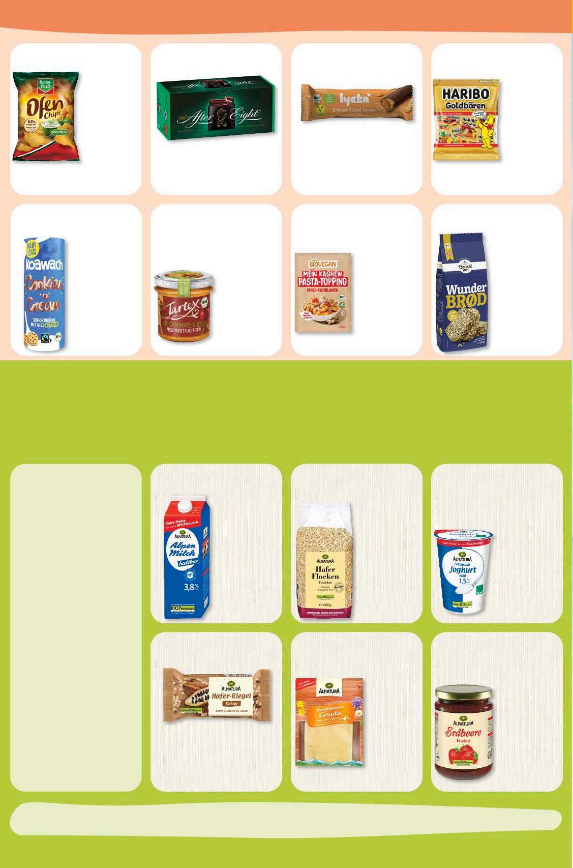 genuss Funny-frisch Ofen Chips versch. Sorten 125 g 1 kg = 9,52 1,19 -40% UVP 1,99 After Eight 200 g 1 kg = 7,45 1,49 -35% UVP 2,29 Tartex Aufstrich versch. Sorten vegan 135/140 g 1 kg = 16,22/15,64 2,19 -22% UVP 2,79 Biovegan Chili Knoblauch Pasta Topping vegan 50 g 1 kg = 39,80 1,99 -29% UVP 2,79 Koawach versch. Sorten 235 ml 1 l = 6,34 1,49 -25% UVP 1,99 Alnatura Gouda1 125 g 1 kg = 13,52 1,69 -23% UVP 2,19 Alnatura Hafer-Riegel versch. Sorten 60 g 1 kg = 16,50 0,99 -29% UVP 1,39 Lycka Schokoriegel versch. Sorten vegan 40 g 1 kg = 24,75 0,99 -23% UVP 1,29 Alnatura H-Milch 1,5 oder 3,8% 1 Liter 1,29 -13% UVP 1,49 Alnatura Haferflocken 1 kg 2,19 -12% UVP 2,49 0,99 -17% UVP 1,19 Alnatura Natur Joghurt1 500 g 1 l = 1,98 Alnatura Fruchtaufstrich versch. Sorten 420 g 1 kg = 5,45