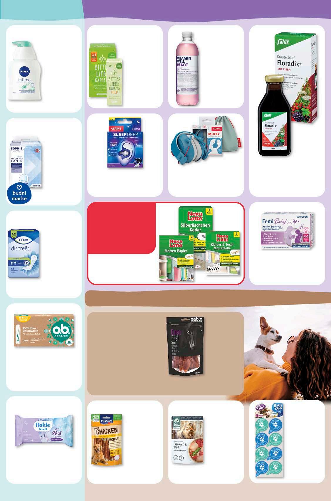 hygiene gesundheit tiernahrung Abgabe in haushaltsüblichen Mengen. ab 5,69 Sophie HygienePants versch. Größen Packung BitterLiebe Tropfen oder Kapseln versch. Sorten 50 ml/53 g 1 l/kg = 259,80/245,09 12,99 -13% UVP 14,99 Tena Discreet Hygieneeinlagen versch. Sorten Packung 3,19 -20% UVP 3,99 tierisch lecker. Pablo bietet Deinem Hund kleinere und größere Leckereien – egal ob als Trocken- und Nassfutter oder Belohnung zwischendurch. Nivea Intimo Waschlotion versch. Sorten 250 ml 1 l = 7,96 1,99 -33% UVP 2,99 o.b. Organic Tampons versch. Sorten Packung aktion 2,49 Hakle Feuchtes Toilettenpapier versch. Sorten 42 Stück 1,19 -46% UVP 2,19 Finé Milk Caps 8x 15 g 1 kg = 16,58 1,99 Pure Nature Katzennahrung versch. Sorten 85 g 1 kg = 11,65 0,99 -17% UVP 1,19 Vitakraft HundeKaustangen versch. Sorten 80 g 1 kg = 23,63 1,89 -17% UVP 2,29 Tetesept Femi Baby 2x 30 Kapseln 61 g 1 kg = 130,98 7,99 -20% UVP 9,99 Salus Kräuterblut Floradix mit Eisen 250 ml 1 l = 31,96 7,99 -29% UVP 11,25 Alpine Muffy Kids Gehörschutz versch. Farben Stück 18,99 -24% UVP 24,95 Alpine Ohrstöpsel versch. Sorten Paar aktion 12,99 Vitamin Well Vitamindrink versch. Sorten zzgl. 0,25 € Pfand Gesamtpr. 1,74 € 500 ml 1 l = 2,98 1,49 -25% UVP 1,99 Pablo Hundenahrung versch. Sorten 100 g 1 kg = 24,90 2,49 budni marke budni marke 10% rabatt auf alle artikel von