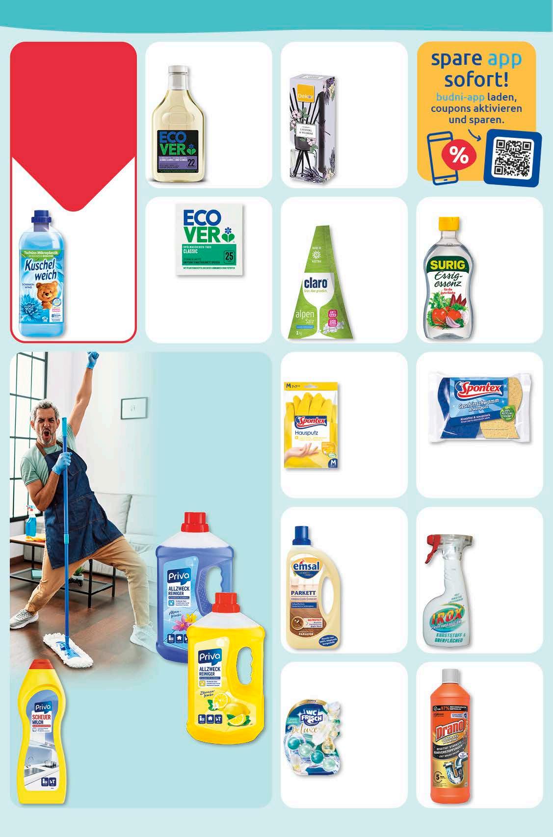 waschen & haushalt Abgabe in haushaltsüblichen Mengen. Ecover Feinwaschmittel versch. Sorten vegan 22 WL 1 WL = 0,14 2,99 -30% UVP 4,29 Emsal Bodenpflege versch. Sorten 1 Liter 3,99 -27% UVP 5,49 Ecover Spülmaschinen-Tabs vegan 25 WL 1 WL = 0,20 4,99 -23% UVP 6,49 Kuschelweich Weichspüler versch. Sorten 38 WL 1 WL = 0,04 1,59 -20% UVP 1,99 2,79 aktion Irox Reiniger versch. Sorten 500 ml 1 l = 5,58 Drano Power-Gel Rohrfrei 1 Liter 2,79 -26% UVP 3,79 WC Frisch Duftspüler Deluxe oder Brilliant versch. Sorten 50 g 1 kg = 39,80 1,99 -23% UVP 2,59 Dekor Raumduft versch. Sorten 100 ml 1 l = 55,90 5,59 budni marke Priva Scheuermilch 750 ml 1 l = 1,32 0,99 0,99 aktion Surig Essigessenz vegan 400 g 1 kg = 2,48 Priva Allzweckreiniger versch. Sorten 1 Liter 1,19 Claro Alpensalz 1 kg 1,49 -25% UVP 1,99 saubere leistung! Für ein strahlend sauberes Zuhause zum Wohlfühlen: die kraftvollen Reinigungsund Putzmittel von Priva budni marke Spontex Geschirrschwamm 2 Stück 1,49 -25% UVP 1,99 Spontex Hausputz Handschuhe versch. Größen Paar 1,49 -25% UVP 1,99 dienstag happy deal am 1,49 UVP 1,99 -25% 1 WL = 0,04