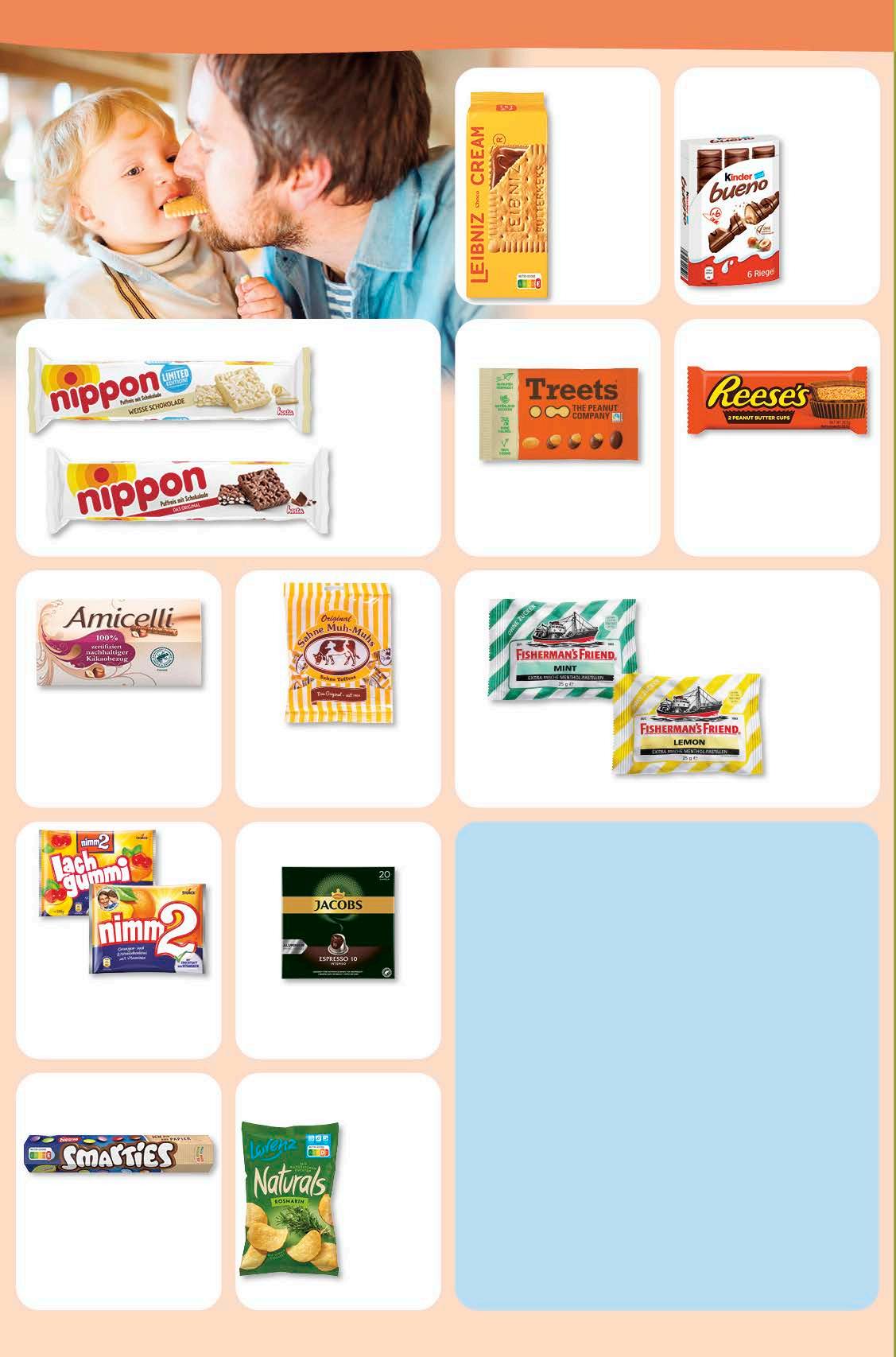 genuss Abgabe in haushaltsüblichen Mengen. Treets Peanuts 185 g 1 kg = 8,05 1,49 -17% UVP 1,79 Leibnitz Cream Schoko 228 g 1 kg = 6,54 1,49 -25% UVP 1,99 Original Sahne MuhMuhs Toffees 215 g 1 kg = 8,33 1,79 -18% UVP 2,19 Nimm2 versch. Sorten 200/145 g 1 kg = 4,45/6,14 0,89 -10% UVP 0,99 Smarties Riesenrolle 130 g 1 kg = 8,54 1,11 -30% UVP 1,59 Kinder Bueno versch. Sorten 6 Stück 129 g 1 kg = 13,88 1,79 -31% UVP 2,59 Nippon versch. Sorten 200 g 1 kg = 5,95 1,19 -32% UVP 1,75 Reese‘s Peanut Butter Cups 39,5 g 1 kg = 19,49 0,77 -35% UVP 1,19 Amicelli 200 g 1 kg = 9,95 1,99 -46% UVP 3,69 Fisherman‘s Friend Pastillen versch. Sorten 25 g 1 kg = 31,60 0,79 -28% UVP 1,09 Jacobs Kapseln versch. Sorten 104 g 1 kg = 38,37