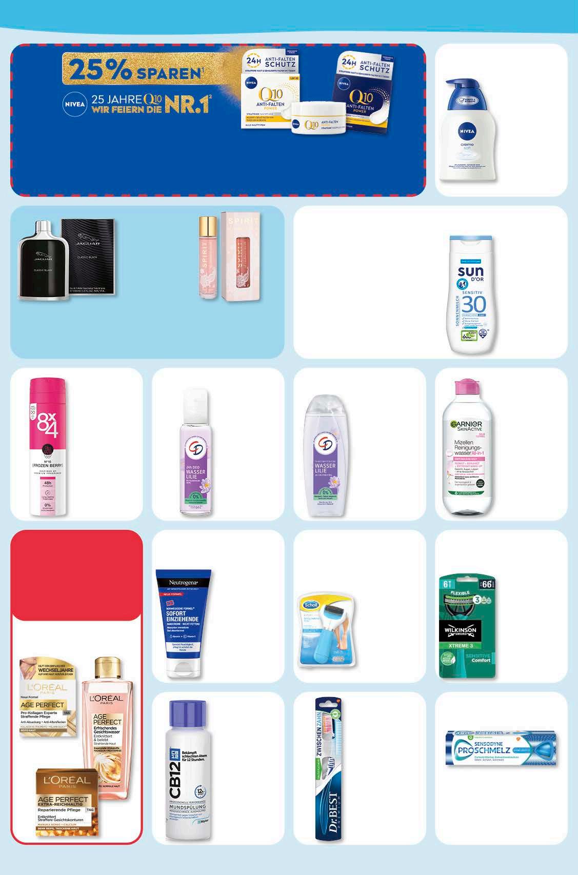 pflege & frische Nivea Flüssigseife versch. Sorten 250 ml 1 l = 6,36 1,59 -31% UVP 2,29 8x4 Deo Spray versch. Sorten 150 ml 1 l = 15,93 2, 39 -20% UVP 2,99 Garnier Mizellen Reinigungswasser versch. Sorten 400 ml 1 l = 8,23 3,29 -27% UVP 4,49 CD Deo Zerstäuber versch. Sorten 75 ml 1 l = 34,53 2,59 -13% UVP 2,99 Sensodyne Proschmelz Zahnceme versch. Sorten 75 ml 1 l = 50,53 3,79 -16% UVP 4,49 CB12 Mundspülung versch. Sorten 200 ml 1 l = 31,45 6,29 -10% UVP 6,99 Wilkinson Xtreme 3 Sensitive Einwegrasierer 6 Stück 4,49 -10% UVP 4,99 Scholl Expert Care Hornhautentferner Stück 19,95 -50% UVP 39,99 Spirit Eau de Parfum versch. Sorten 30 ml 3,99 -11% UVP 4,49 Jaguar Eau de Toilette versch. Sorten 100 ml 14,99 -46% UVP 27,80 düfte der woche Sun D‘or Sonnenmilch Sensitiv LSF 30 vegan 250 ml 1 l = 18,76 4,69 budni marke Neutrogena Handcreme versch. Sorten 75 ml 1 l = 37,20 2,79 -20% UVP 3,49