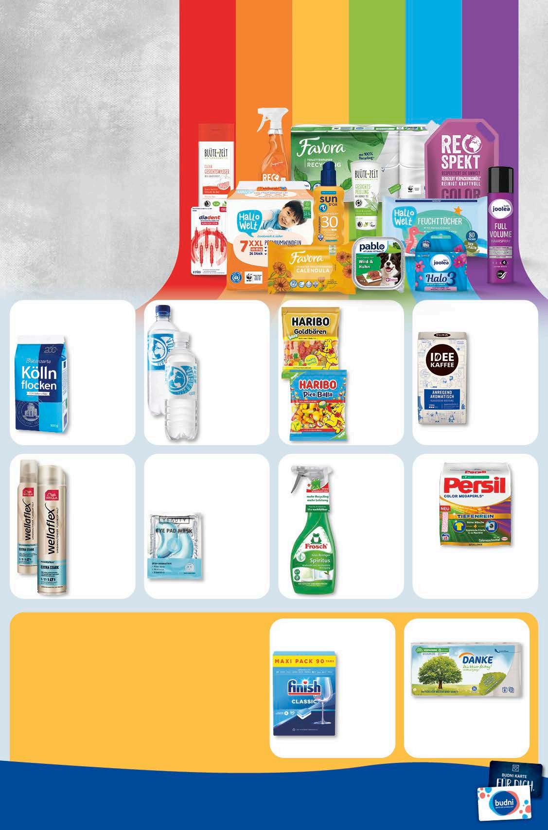 budni-app öffnen und Angebote abrufen oder budni-karte am Service-Punkt scannen und Sparschein ziehen. 1 Angebotsartikel mit zur Kasse nehmen. 2 budni-karte an der Kasse scannen und Rabatt er halten. 3 Danke Toilettenpapier 3-lagig 8x 150 Blatt 2,99 -21% UVP 3,79 Idee oder Eilles Kaffee 500 g 1 kg = 8,98 4,49 -42% UVP 7,79 Persil Waschmittel versch. Sorten 16 WL 1 WL = 0,34 aktion 5,49 Wellaflex Haarspray oder Schaumfestiger versch. Sorten 250/200 ml 1 l = 7,96/9,95 1,99 -29% UVP 2,79 max. 12 Packungen