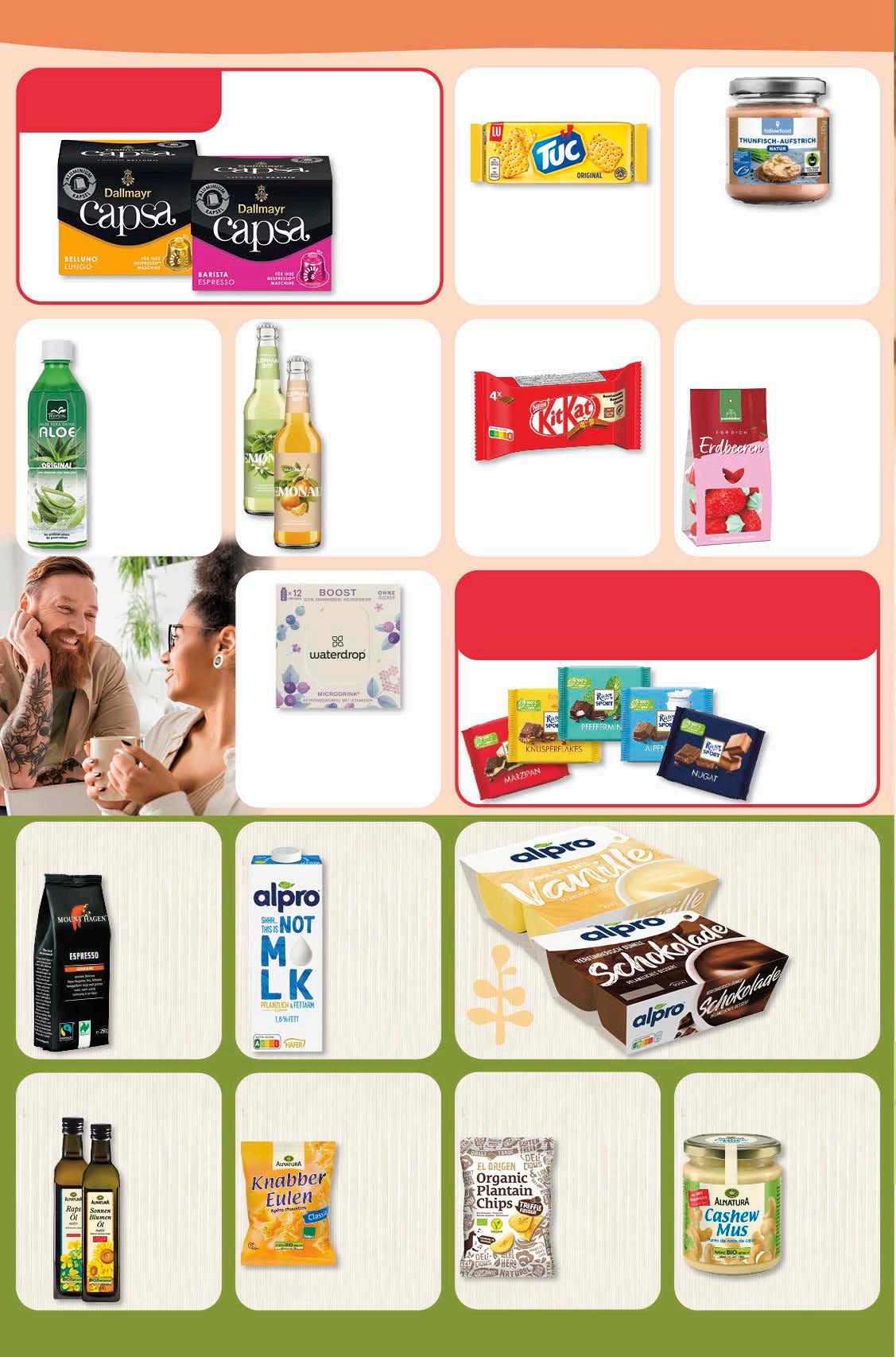genuss Abgabe in haushaltsüblichen Mengen. Tropical Aloe Vera Drink versch. Sorten zzgl. 0,25 € Pfand Gesamtpr. 1,74 € 500 ml 1 l = 2,98 1,49 -17% UVP 1,79 Elephant Bay Lemonade versch. Sorten zzgl. 0,08 € Pfand Gesamtpr. 1,37 € 330 ml 1 l = 3,91 Waterdrop Microdrink versch. Sorten 12x 2 g 1 kg = 249,58 5,99 -20% UVP 7,49 TUC Cracker 100 g 1 kg = 7,90 0,79 -28% UVP 1,09 Kit Kat 4x 41,5 g 1 kg = 7,77 1,29 -35% UVP 1,99 El Origen Chips versch. Sorten vegan 60/80 g 1 kg = 28,17/21,13 1,69 -15% UVP 1,99 Alnatura Cashewoder Mandelmus vegan 250 g 1 kg = 21,16 5,29 -12% UVP 5,99 Followfish ThunfischCreme versch. Sorten 110 g 1 kg = 31,73 3,49 -13% UVP 3,99 Mount Hagen Kaffee versch. Sorten 250 g 1 kg = 19,96 4,99 -17% UVP 5,99 knaller-preis Dallmayr Capsa Kaffeekapseln versch. Sorten 56 g 1 kg = 44,46 2,49 -24% UVP 3,29 Naschlabor Marshmallows 100 g 1 kg = 24,90 2,49 -17% UVP 2,99 Alnatura Knabber Eulen 100 g 1 kg = 11,90 Alnatura Sonnenblumen- oder Rapsöl nativ vegan 500 ml 1 l = 5,18 2,59 aktion max. 12 Packungen 1,29 aktion Alpro Haferdrink This is not Milk versch. Sorten vegan 1 Liter 1,49 -40% UVP 2,49 1,19 -14% UVP 1,39 Alpro Soya Dessert versch. Sorten vegan 4x 125 g 1 kg = 2,98 1,49 -38% UVP 2,39 4 für 3€ entspr./stück 0,75 1 kg = 7,50 Ritter Sport Bunte Vielfalt versch. Sorten 100 g UVP 1,49 Einzelpreis 0,88 -41% 1 kg = 8,80