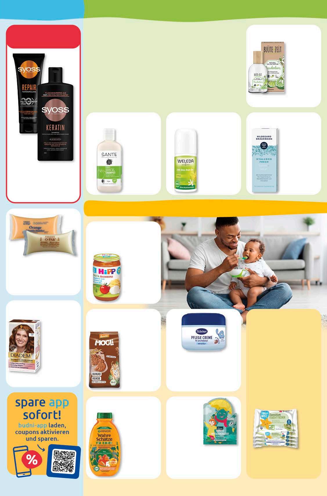 mehr süßwasserschutz für mehr artenvielfalt für mehr klimaschutz Mehr Infos findest Du unter: budni.de/wegweiser Blüte-Zeit Freudentanz Eau de Parfum 50 ml 6,99 budni marke Hallo Welt Babytücher Sensitive versch. Sorten 4x 80 Stück 3,49 budni marke Weleda Deo Roll-On versch. Sorten 50 ml 1 l = 119,80 5,99 -14% UVP 6,99 Braukmann Hyaluron Fresh Serum vegan 30 ml 1 l = 399,67 11,99 -20% UVP 14,99 Sante Shampoo versch. Sorten 250 ml 1 l = 13,96 3,49 -19% UVP 4,29