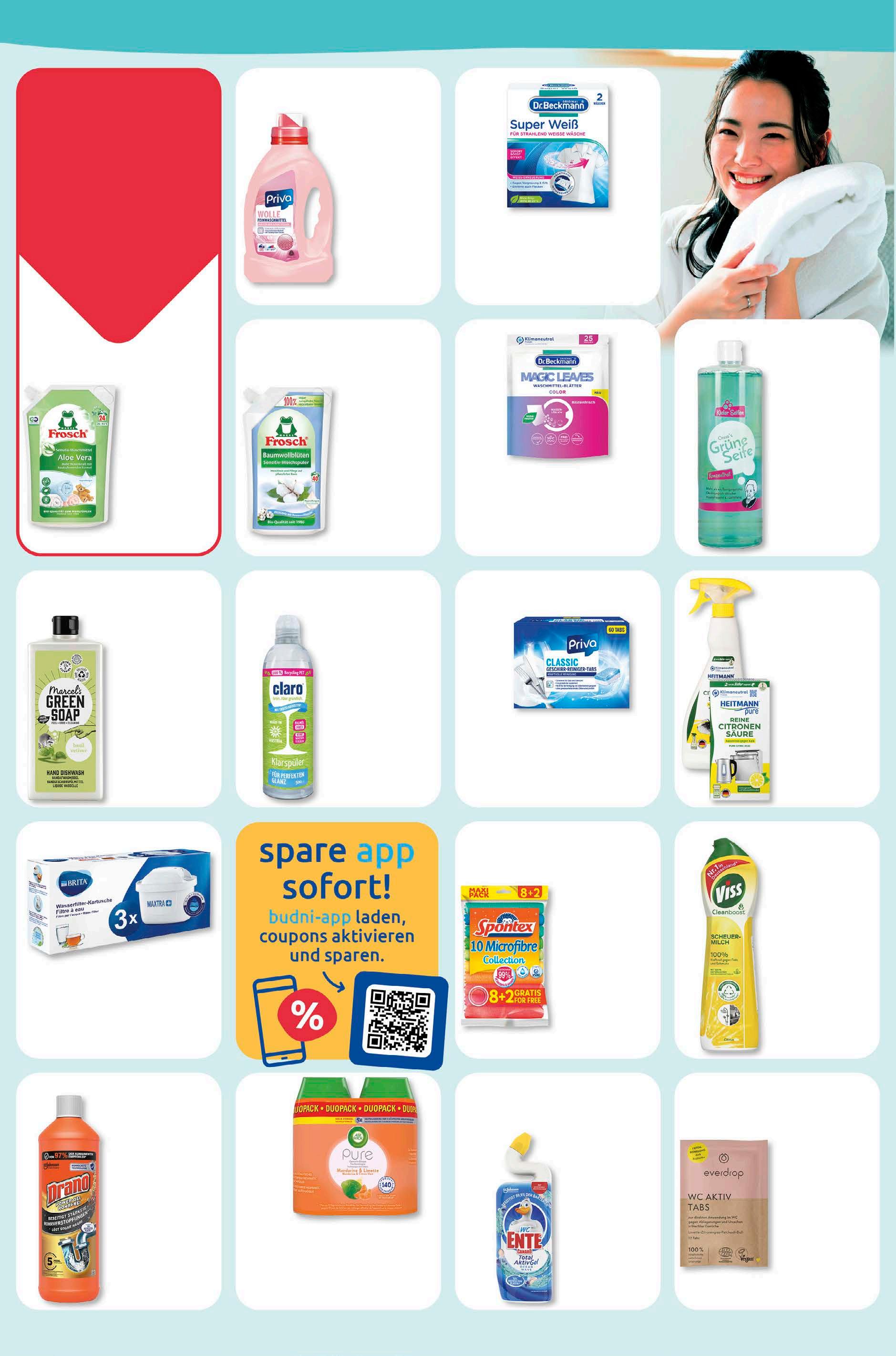 waschen & haushalt Abgabe in haushaltsüblichen Mengen. Spontex Mikrofaser Allzwecktücher Maxipack 10 Stück 3,99 -20% UVP 4,99 Everdrop WC Aktiv Tabs 12 Stück 2, 39 -20% UVP 2,99 Brita Maxtra+ Filterkartusche 3 Stück 13,99 -38% UVP 22,49 Green Soap Spülmittel versch. Sorten vegan 500 ml 1 l = 3,98 1,99 -20% UVP 2,49 WC-Ente Total Aktiv Gel1 versch. Sorten 750 ml 1 l = 2,52 1,89 -24% UVP 2,49 1 Biozidprodukte vorsichtig verwenden. Vor Gebrauch stets Etikett und Produktinformation lesen. Priva Spülmaschinen-Tabs Classic 60 WL 1 WL = 0,06 3,45 budni marke Dr. Beckmann Super Weiß 80 g 1 kg = 18,63 1,49 -25% UVP 1,99 Heitmann Citronensäure 350 g/500 ml 1 kg/l = 8,54/5,48 2,99 -19% UVP 3,69 dienstag happy deal am 4,29 UVP 4,99 -14% 1 WL = 0,18 Frosch Waschmittel versch. Sorten 24 WL 1 WL = 0,19 4,49 -10% UVP 4,99 Viss Scheuermilch versch. Sorten 500 ml 1 l = 2,78 1, 39 -44% UVP 2,49 Frosch Weichspüler versch. Sorten 40 WL 1 WL = 0,04 1,79 -22% UVP 2,29 Dr. Beckmann Magic Leaves Waschmittelblätter versch. Sorten 25 Stück 2,99 -25% UVP 3,99 Priva Feinwaschmittel versch. Sorten 37 WL 1 WL = 0,09 3,15 budni marke Drano Power-Gel Rohrfrei 1 Liter 2,79 -26% UVP 3,79 Airwick FreshmaticLufterfrischer versch. Sorten 2x 250 ml 1 l = 12,78 6, 39 -29% UVP 8,99 Claro Klarspüler 500 ml 1 l = 3,78 1,89 -24% UVP 2,49 Kieler Seifen Oma‘s Grüne Seife vegan 1 Liter 3,49 -13% UVP 3,99