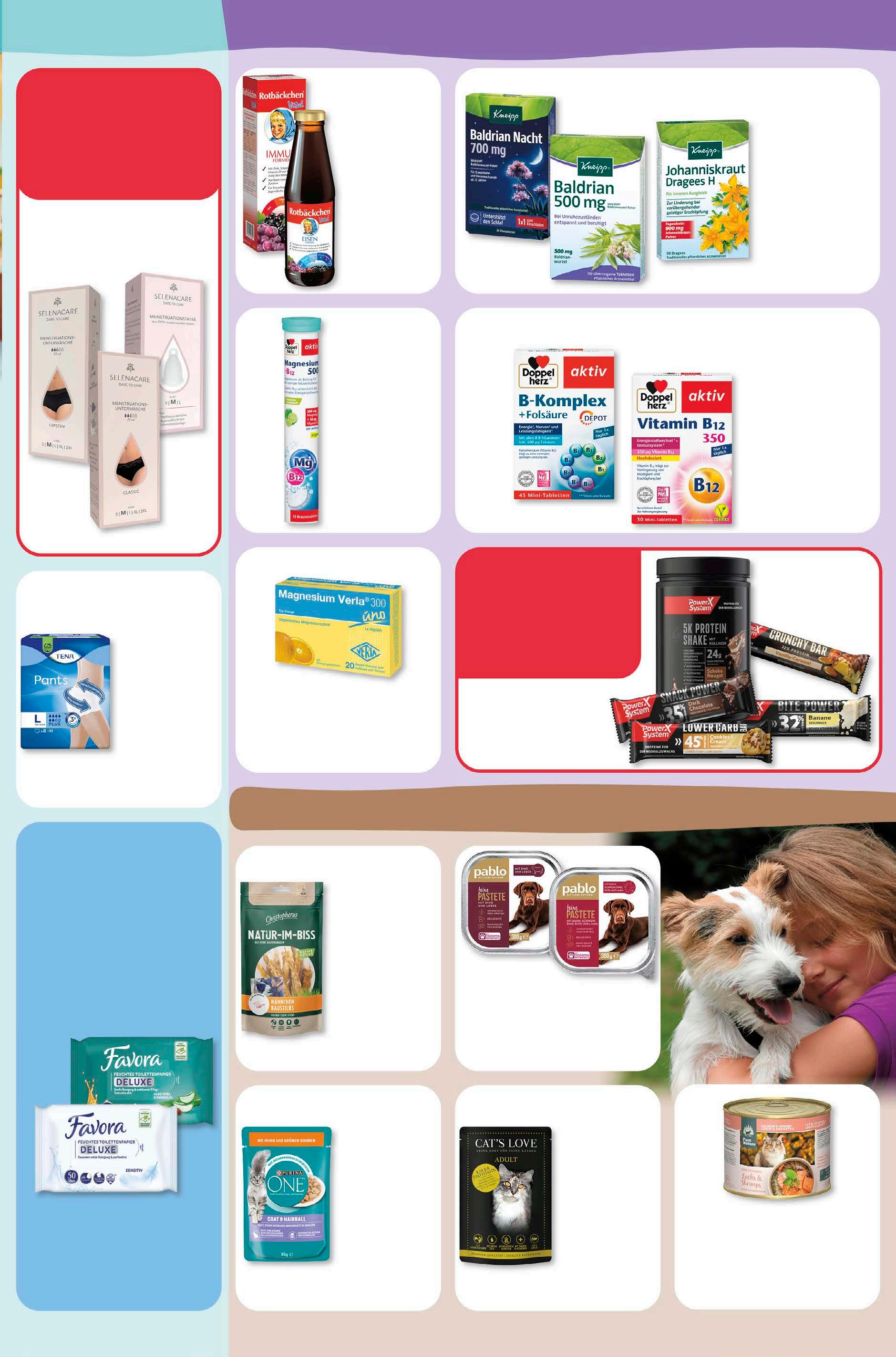 hygiene gesundheit tiernahrung Tena Pants Hygieneeinlagen versch. Größen Packung 7,99 -16% UVP 9,49 Kneipp Johanniskraut, Baldrian 500 mg oder Baldrian Nacht 700 mg Packung aktion 3,99 90 Stück 90 Stück 30 MiniTabletten 30 Stück Purina One Katzennahrung versch. Sorten 85 g 1 kg = 6,47 0,55 -30% UVP 0,79 45 Tabletten Doppelherz B-Komplex+ Folsäure Depot oder Vitamin B12 350 14,1/12,5 g 1 kg = 169,50/191,20 2, 39 -20% UVP 2,99 Doppelherz Magnesium 500+B12 15 Brausetabletten 97,5 g 1 kg = 24,51 2, 39 -27% UVP 3,29 Magnesium Verla 300 Orange 20 Beutel 6,49 -33% UVP 9,70 Favora Deluxe Feuchtes Toilettenpapier versch. Sorten 50 Stück 1,29 Christopherus Natur-Im-Biss Hundesnack versch. Sorten 70 g 1 kg = 25,57 1,79 -25% UVP 2,39 Pablo Feine Pastete Hundenahrung versch. Sorten 300 g 1 kg 2,63 0,79 budni marke Cats Love Katzennahrung versch. Sorten 85 g 1 kg = 11,65 0,99 -23% UVP 1,29 Pure Nature Katzennahrung versch. Sorten 190/200 g 1 kg = 7,84/7,45 1,49 -12% UVP 1,69