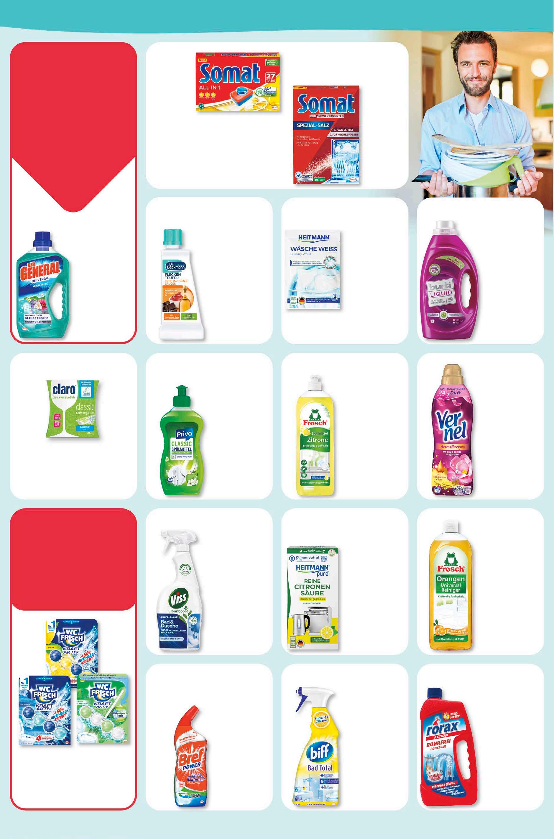 waschen & haushalt Abgabe in haushaltsüblichen Mengen. Priva Geschirrspülmittel versch. Sorten 500 ml 1 l = 1,98 0,99 budni marke Bref Power WCKraft Gel1 750 ml 1 l = 3,05 2,29 -23% UVP 2,99 1 Biozidprodukte vorsichtig ver wenden. Vor Gebrauch stets Etikett und Produktinformation lesen. Biff Bad Total Zitrus 750 ml 1 l = 3,05 2,29 -23% UVP 2,99 Viss Kraft & Glanz Reiniger versch. Sorten 750 ml 1 l = 2,39 1,79 -10% UVP 1,99 Heitmann Citronensäure versch. Sorten 350 g 1 kg = 8,54 2,99 -19% UVP 3,69 Frosch Spülmittel versch. Sorten 500/750 ml 1 l = 2,98/1,99 1,49 -25% UVP 1,99 Dr. Beckmann Fleckenteufel versch. Sorten 50 ml 1 l = 31,80 1,59 -31% UVP 2,29 Burti Waschmittel versch. Sorten 26 WL 1 WL = 0,10 2,49 -29% UVP 3,49 Heitmann WäscheWeiss 50 g 1 kg = 15,80 0,79 -20% UVP 0,99 Frosch Universal Reiniger versch. Sorten vegan 750 ml 1 l = 2,25 1,69 -26% UVP 2,29 Rorax Rohrfrei Gel vegan 1 Liter 2,69 -23% UVP 3,49 Somat SpülmaschinenTabs versch. Sorten 27 WL UVP 5,79 Einzelpreis 4,49 -22% 1 WL = 0,17 Somat SpezialSalz vegan 1,2 kg UVP 1,29 Einzelpreis 0,99 -23% 1 kg = 0,83 4,99 30% UVP 7,08 zusammen + 1, 39 UVP 1,99 1 l = 1,85 dienstag happy deal am -30% Vernel Weichspüler versch. Sorten 32 WL 1 WL = 0,04 1,29 -35% UVP 1,99 Claro GeschirrspülTabs versch. Sorten 40 WL 1 WL = 0,11 4,29 -22% UVP 5,49 entspr./stück 1,33 1 kg = 24,18 3 für 2 WC Frisch Duftspüler versch. Sorten 55 g Einzelpreis 1,99 1 kg = 36,18 Der General Reiniger versch. Sorten 750 ml UVP 1,99 Einzelpreis 1,59 -20% 1 l = 2,12