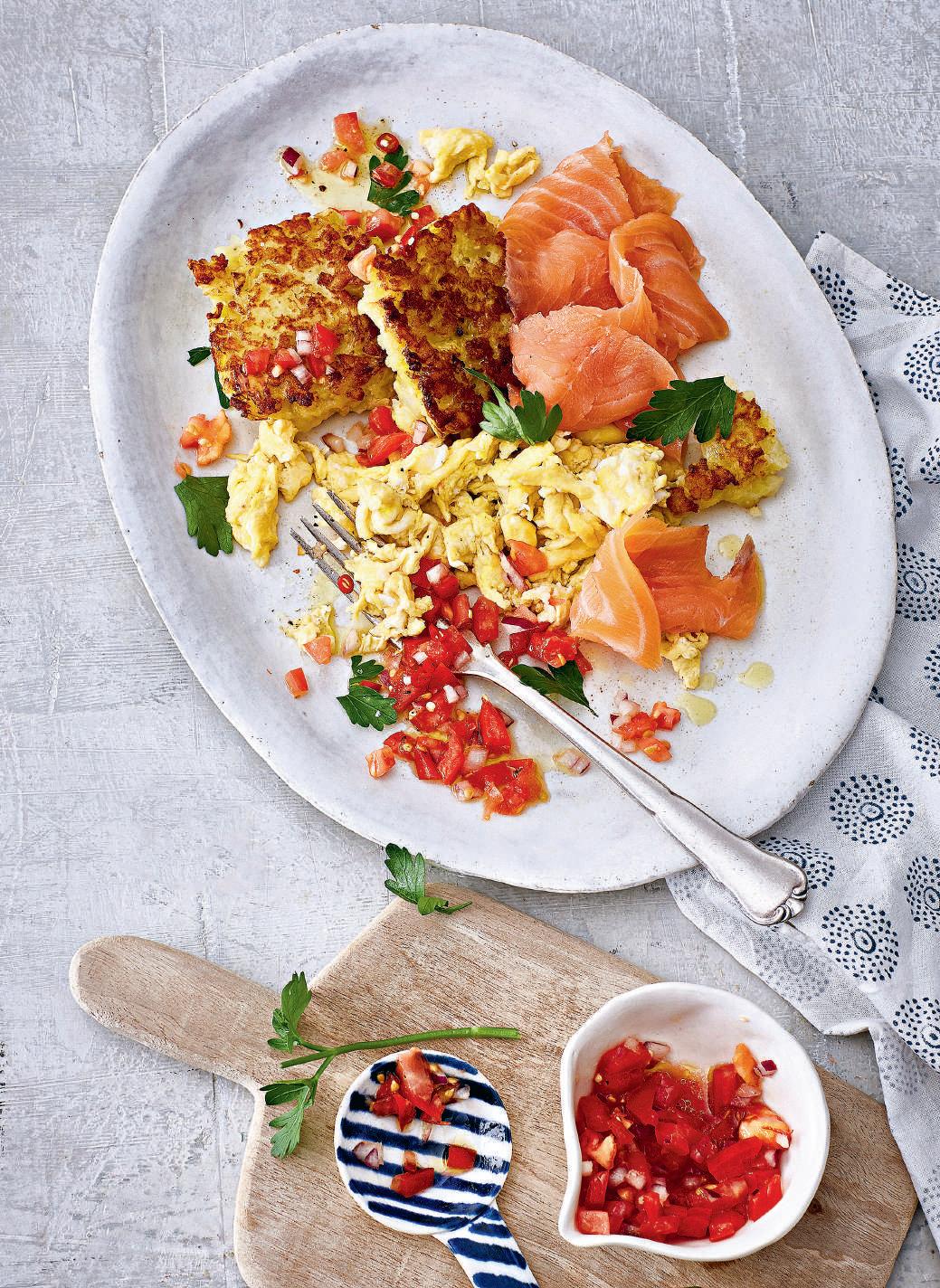 6 Die Hash-Browns, Rührei, Räucherlachs und Tomatenrelish auf Tellern verteilen und mit Petersilie garnieren.
