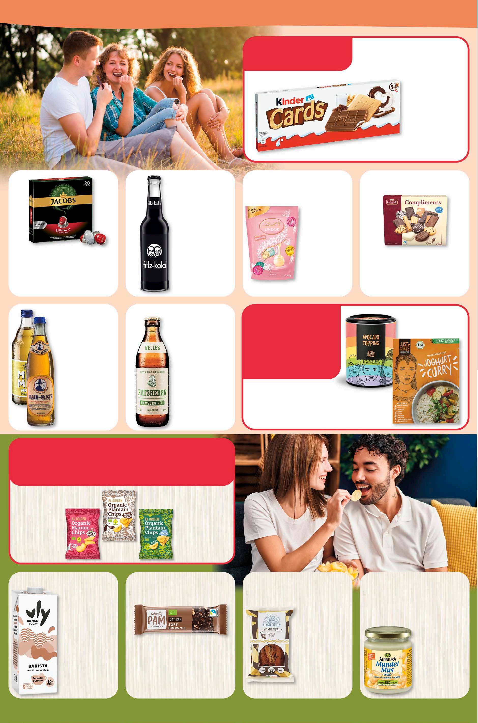 Jacobs Kaffee Kapseln versch. Sorten 104 g 1 kg = 38,37 aktion 3,99 Naturally Pam Riegel versch. Sorten vegan 40 g 1 kg = 49,75 El Origen Chips versch. Sorten vegan 60 g Einzelpreis 1,99 1 kg = 33,17 3 für 5€ entspr./stück 1,67 1 kg= 27,83 Kinder Cards 128 g 1 kg = 12,42 1,59 -39% UVP 2,59 5,99 aktion Fritz Kola versch. Sorten zzgl. 0,08 € Pfand Gesamtpr. 1,07 € 330 ml 1 l = 3,00 0,99 -14% UVP 1,15 Lindt Lindor Sommer-Mix 400 g 1 kg = 16,65 6,66 -17% UVP 7,99 Lambertz Gebäckmischung 500 g 1 kg = 6,58 3,29 -18% UVP 3,99 Club-Mate oder Mio Mio Mate versch. Sorten zzgl. 0,15 € Pfand Gesamtpr. 0,94 € 500 ml 1 l = 1,58 0,79 -20% UVP 0,99 Ratsherrn Bier versch. Sorten zzgl. 0,08 € Pfand Gesamtpr. 0,97 € 330 ml 1 l = 2,70 0,89 -18% UVP 1,09 20% rabatt auf alle artikel von just spices. 1,99 -13% UVP 2,29 Alnatura Mandelmus versch. Sorten vegan 250 g 1 kg = 23,96 3,99 aktion Glowkitchen Bananenbrot versch. Sorten vegan 300 g 1 kg = 13,30 Vly Barista Milchalternative versch. Sorten vegan 1 Liter 1,99 -20% UVP 2,49 knaller-preis genuss Abgabe in haushaltsüblichen Mengen.