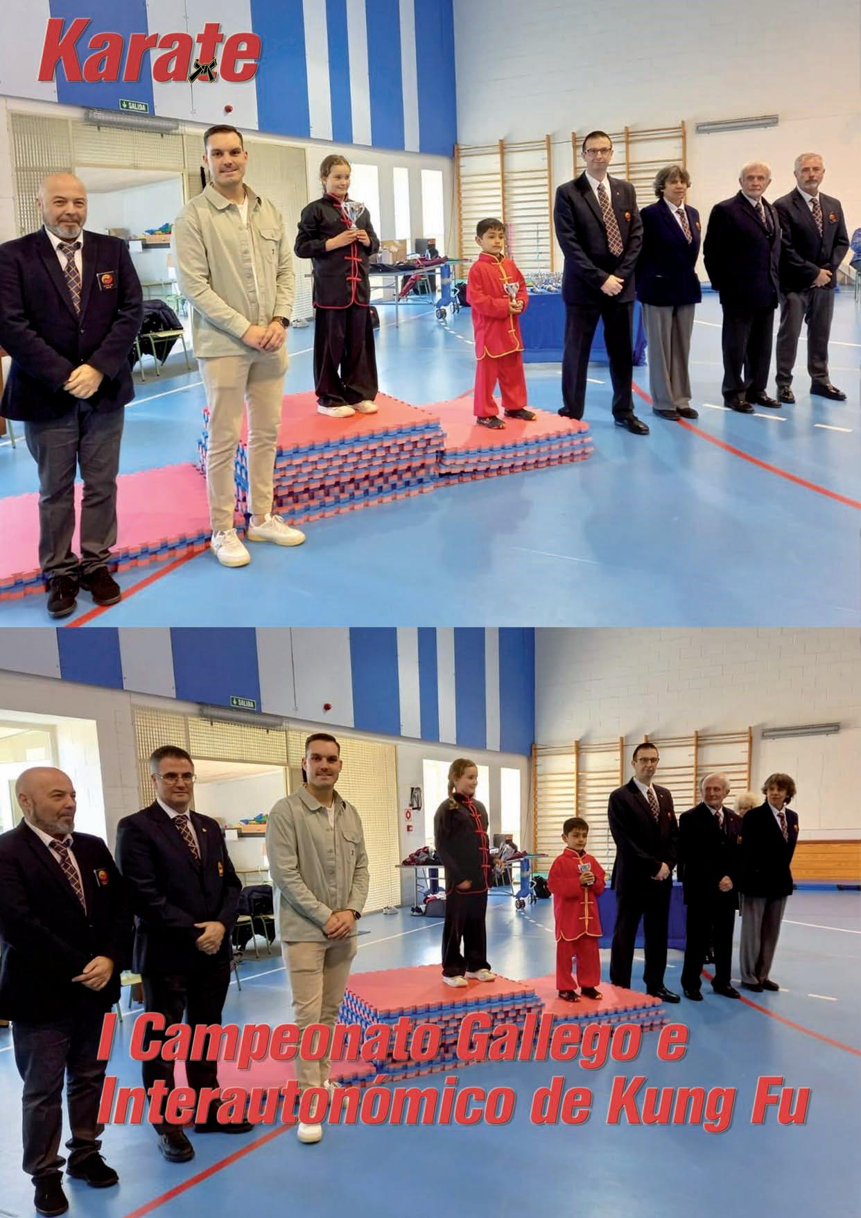 El pasado 28 de abril, la Federación Gallega de Karate y Disciplinas Asociadas, celebró en Cervo (Lugo) el I Campeonato Gallego e Interautonómico de Kung Fu en las modalidades de Taolu Taiji, tanto en mano vacía como arma, así como en individual y dúos, y Tuishou (empuje de manos) para todas las categorías, desde alevín hasta veteranos. Ha contado con la participación de clubes federados de Asturias, Cantabria, Castilla y León y Cataluña. El campeonato ha servido para coger experiencia de cara al campeonato de España que se celebrará en Medina del Campo (Valladolid) el 16 de noviembre. Como novedad, este año contará con la modalidad de Taolu Duo, ya puesta en práctica en este campeonato. El medallero ha quedado dominado por la comunidad de Galicia, con 7 oros, 5 platas y 3 bronces. El segundo lugar fue para el Principado de Asturias, con 4 oros, 5 platas y 3 bronces y dominando nuevamente la modalidad de Tui Shou. El tercer lugar lo ha ocupado Cataluña, con 1 oro. Nos gustaría agradecer al Ayuntamiento de Cervo su constante colaboración, apoyo y presencia en las diversas actividades realizadas para con el Kung Fu RFEKYDA.