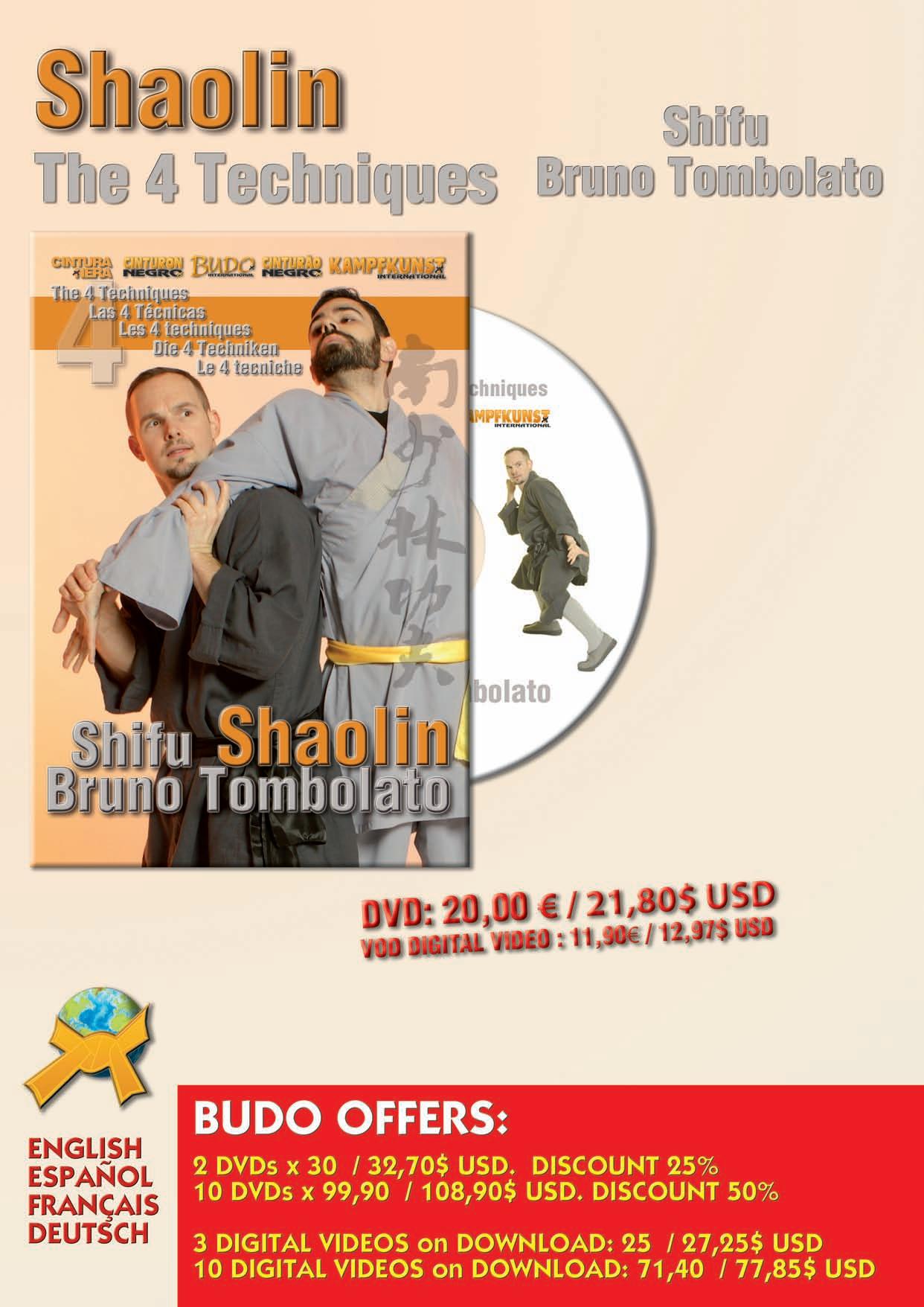 Il Maestro Bruno Tombolato, discepolo di 32a generazione del Tempio Songshan Shaolin, presenta una raccolta di 18 tecniche di combattimento tradizionali dello ShaolinQuan, organizzate secondo le quattro tecniche di difesa e attacco che compongono lo stile: calciare (t ī ), colpire (d ǎ ), lanciare o proiettare (shuāi) e prendere (ná). Le arti marziali cinesi sono rimaste nella storia come un tesoro di stili di combattimento, ognuno con una propria ricchezza e profondità. Queste quattro abilità, fondamentali per i sistemi di Gong Fu, danno un'essenza completa ed equilibrata alla pratica delle arti marziali cinesi. La pratica del Gong Fu cinese impone regole severe sui movimenti di attacco e di difesa. La maestria delle Quattro Tecniche non risiede solo nella perfezione individuale di ciascuna abilità, ma anche nella perfetta integrazione di tutte. Un artista marziale completo capisce che non si tratta di entità separate, ma di componenti interconnesse di un sistema olistico. Nelle arti marziali cinesi, le Quattro Tecniche rappresentano l'essenza stessa del Gong Fu tradizionale.