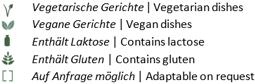 Alle Preise verstehen sich in CHF & inkl. MwSt. All prices are in CHF & incl. of VAT. Für Informationen zu Allergenen in den einzelnen Gerichten wenden Sie sich bitte an unser Service Personal. For information on allergens, please ask our service staff.