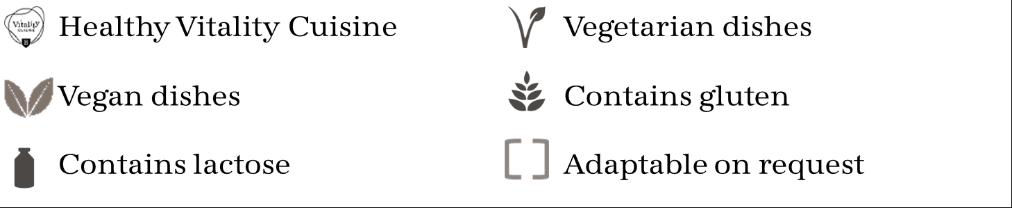 Forinformationonallergens,pleaseaskourservicestaff. Pourd’éventuellesinformationsconcernantlesallergènesprésentsdans lesdiversmenus,veuillezvousadresserànotrepersonneldeservice.