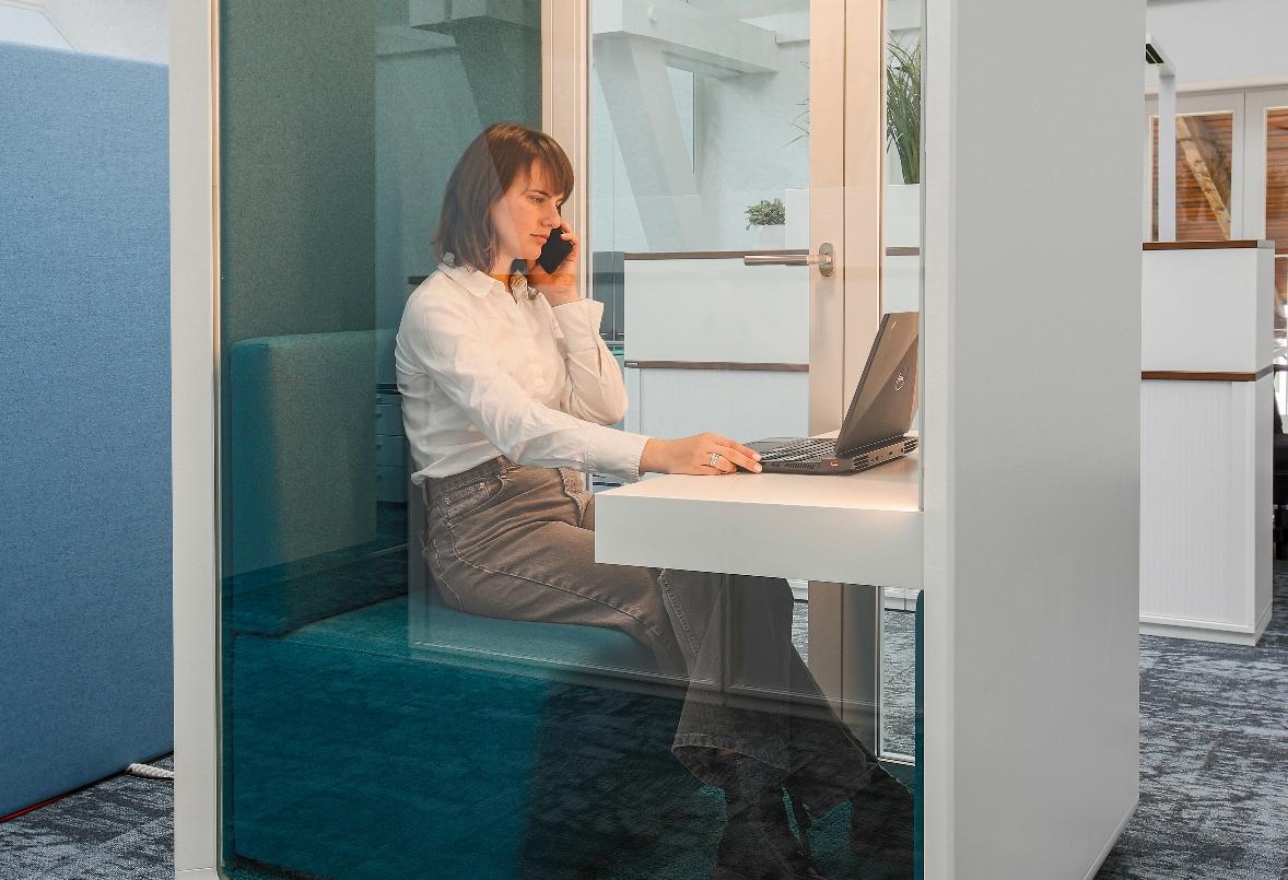 24 Die Telefonzelle schafft ein angenehmes Umfeld im Großraumbüro ohne störende Telefonate.