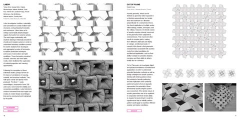 Labor investigates modules, materiality, and connections to create resilient wall structures, and particularly thresholds and enclosures. Labor takes as its setting economically disadvantaged regions that suffer from seismic activity. The work began individually, with students looking at historical precedents of walls and modular systems in order to understand boundary conditions around the world. Students then developed and aggregated a series of formworks to explore production techniques and issues of connections and joint conditions. These formworks consisted of wood, concrete, and even fabric molds, which facilitated the exploration of material properties and massing opportunities. Following the completion of these individual studies, groups formed on the basis of correlations of massing, material, and structural methods. Two wall typesď„„cavity and gravityď„„were produced. The final 1:1 scale assemblages, composed of over 100 units each, were tested for stability and connection possibilities. Labor intends to create a framework that each region can employ to create design assemblages that can be constructed and maintained by the public.