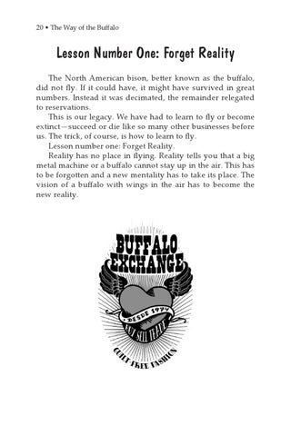 Lesson Number One: Forget Reality The North American bison, better known as the buffalo, did not fly. If it could have, it might have survived in great numbers. Instead it was decimated, the remainder relegated to reservations. This is our legacy. We have had to learn to fly or become extinct—succeed or die like so many other businesses before us. The trick, of course, is how to learn to fly. Lesson number one: Forget Reality. Reality has no place in flying. Reality tells you that a big metal machine or a buffalo cannot stay up in the air. This has to be forgotten and a new mentality has to take its place. The vision of a buffalo with wings in the air has to become the new reality.