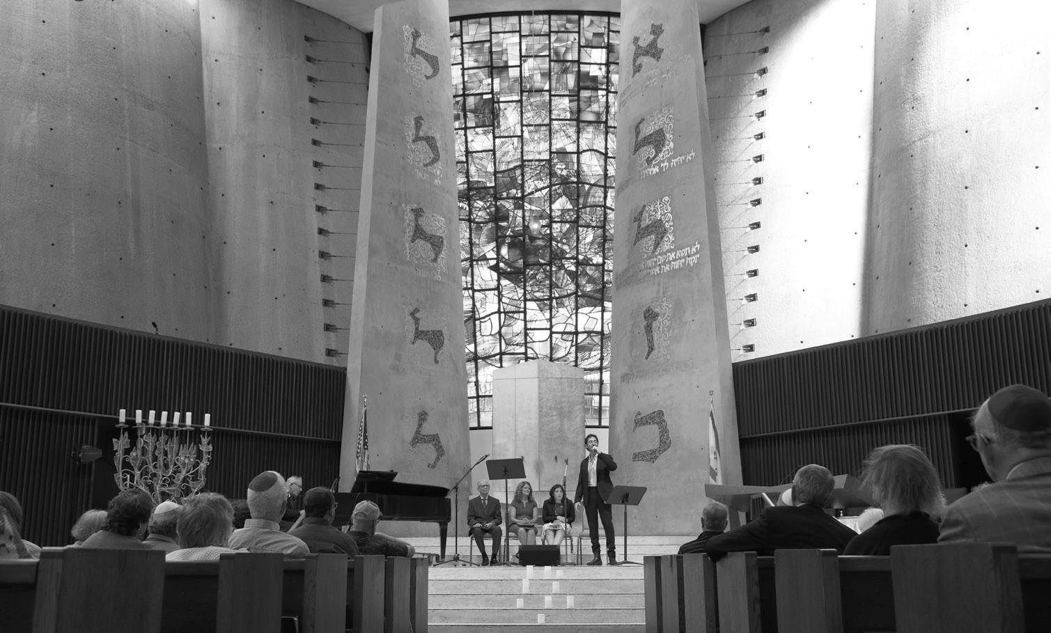 Internationally acclaimed artist Ben Shahn shaped many of the sanctuary’s most striking features, including the Menorah, stained glass windows, and the monumental Ten Commandments tablets that frame the Ark. Between these pillars rest the Torah scrolls, illuminated by the Eternal Light above. The stained glass windows—one inspired by creation, the other by the musical call of Psalm 150—bathe the space in color and meaning, inviting all who enter to reflect, listen, and be uplifted by spirit, sound, and community.