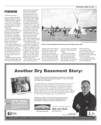 Indian culture. A partnership was born with President and Executive Director of the American Indian Center Joseph Podlasek, who also is the President of the National Urban Indian Family Coalition and a Commissioner of City of Chicago Human Relations commission and the idea of a summer Powwow came to life. A powwow is a gathering of North America’s Native people. The word derives from the Narragansett word powwaw, meaning “spiritual leader.” A modern powwow is a specific type of event where both Native American and NonNative American People meet to dance, sing, socialize, and honor American Indian culture. “The American Indian Center is dedicated to servicing the needs of our community,” said Podlasek.“In addition we want to share our heritage and with the Siegels we can do that in a bigger way. We can start that in this area—it will be a great family event. It will be about getting to know one another and becoming friends.” The main focus of the festival will be on the history and