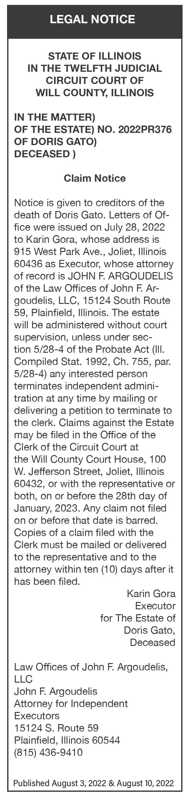 Attorney for: Independent Executor 111 E. Jefferson Ave. Naperville, IL 60540 630-219-4381 Published January 11, 2023, January 18, 2023 & January 25, 2023