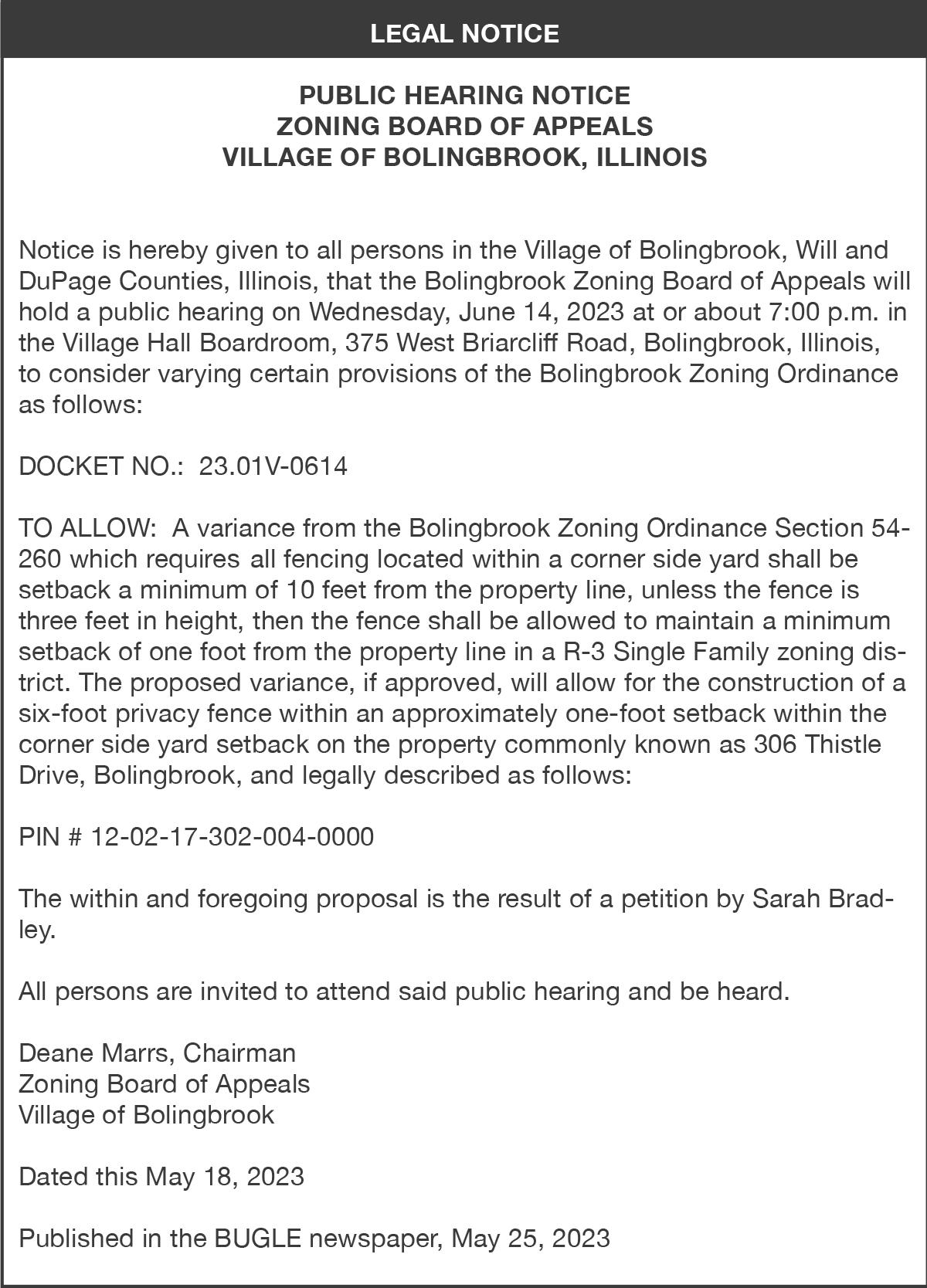 On October 12, 2023 at 9:00 AM, in the Circuit Court of Will County, Will County Courthouse, 100 West Jefferson Street, Courtroom 905, Joliet, Illinois, the Petitioner intends to make an application for an order on the petition that a Tax Deed be issued. The real estate was sold on December 9, 2020, for delinquent real estate taxes and/or special assessments for the year 2019. Certificate No. 19-01386. The period of redemption will expire on October 4, 2023. DG ENTERPRISES, LLC - X, LLC PETITIONER 10732-932799
