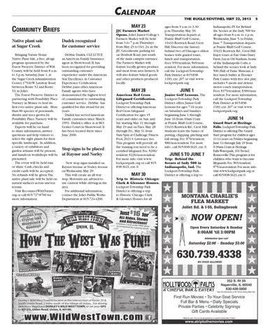 ages from 9 a.m. to 3:30 p.m.Thursday, May 30. Transportation departs at Prairie Bluff Golf Course, 19433 Renwick Road, Crest Hill. Discover the history behind two of Chicago’s oldest homes with guided tours, lunch and transportation. Fees: $59/resident; $69/nonresident. For more information, call the Lockport Township Park District at 815-8381183, ext. 207 or visit www. lockportpark.org.