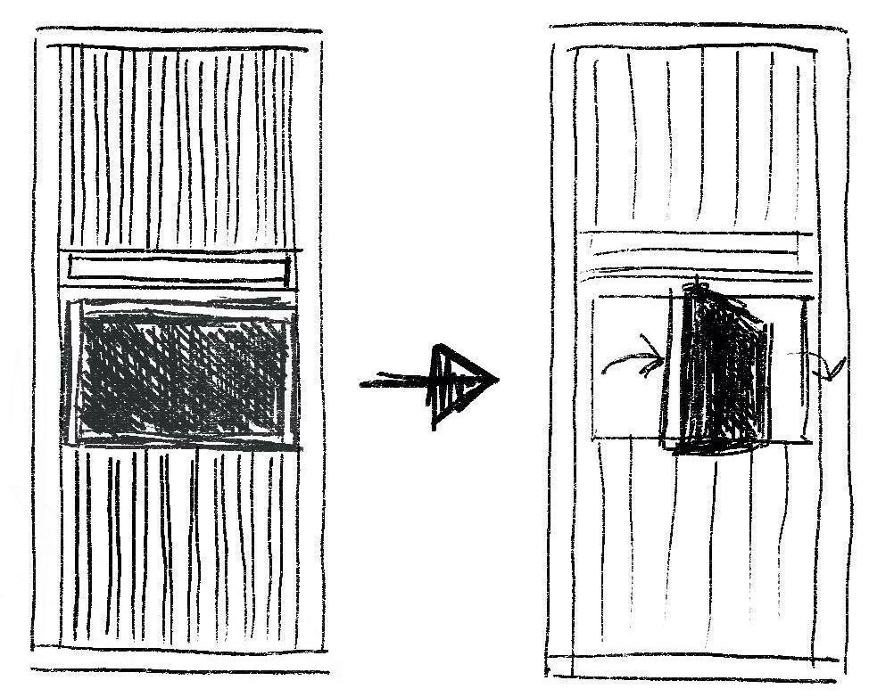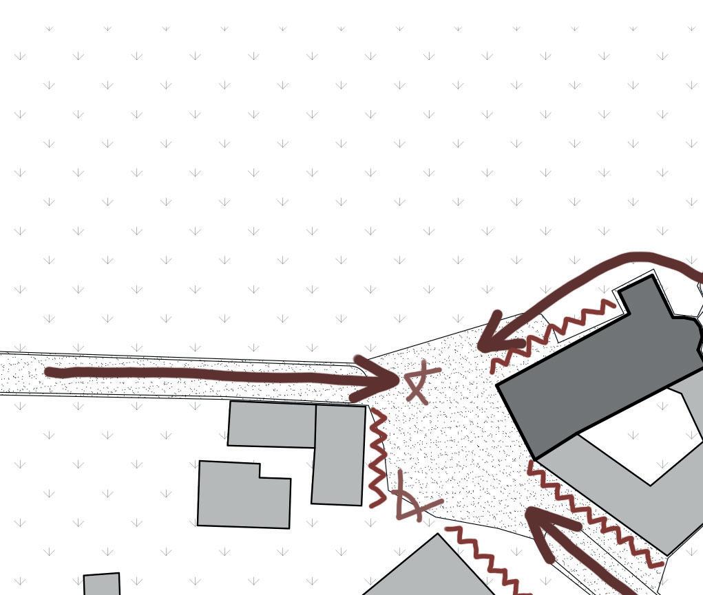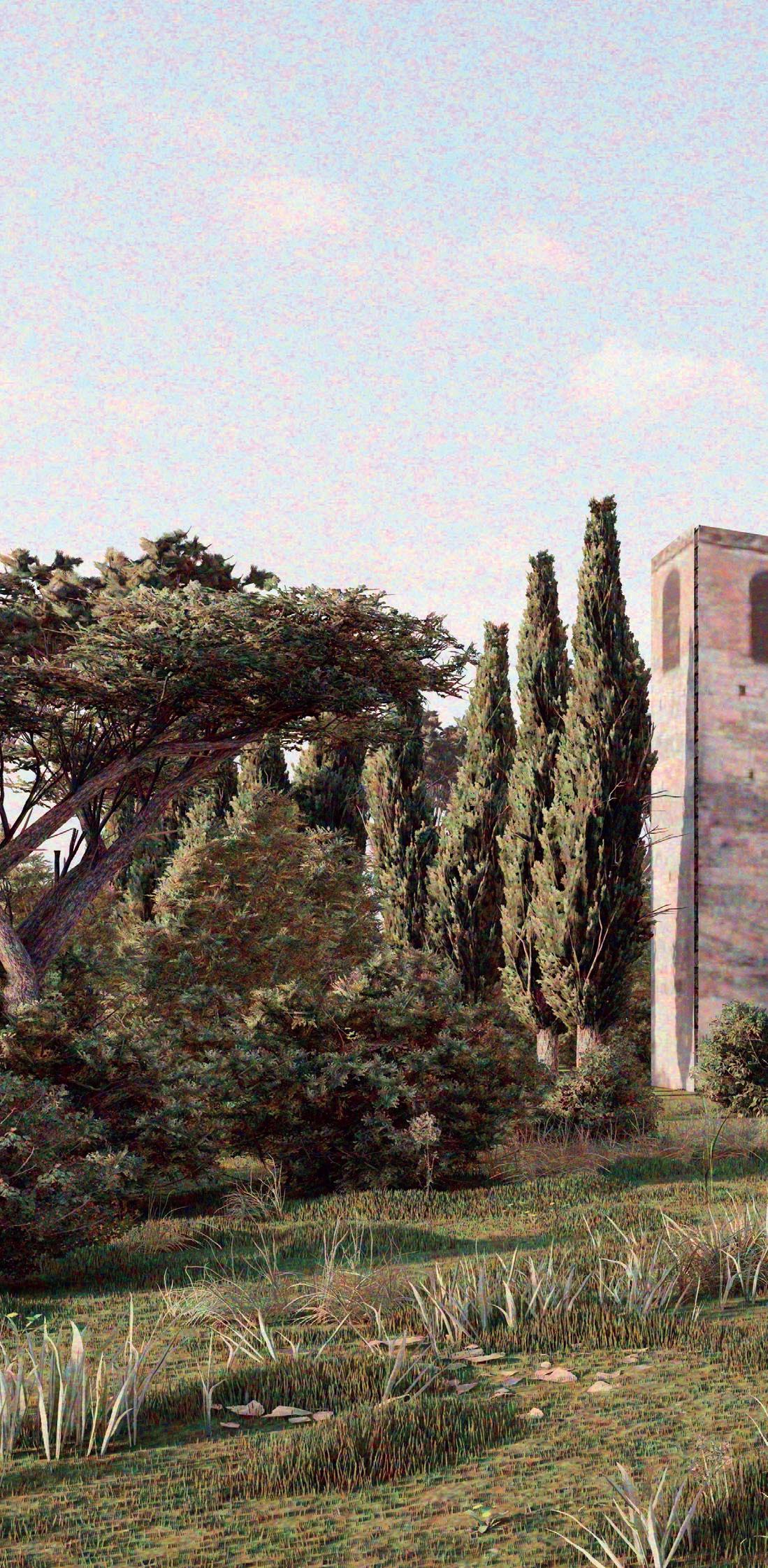 When designing the entrance to the church, I paid particular attention to its location. I decided to use the buildingʼs side wall so as not to alter the 12th century structure and character. As I realised, the square in front of the church lacked a place to rest, sit, and enjoy the view of the temple. Like a gate, my proposed elongated entrance, is showing the way, without imposing itself on San Micheleʼs articulation, or creating a sense of heaviness. The inspiration for this project was the renovation of Scuola di Santa Maria della Misericordia located in Venice undertaken by Alberto Torsello and Gruppo Umana, which created an additional modern space with the possibility of hosting events and exhibitions. The material I chose is copper, which blends in with the surroundings and matures over time. By locating the structure in its proposed spot, I intended to complement and indirectly enclose the space of the square.