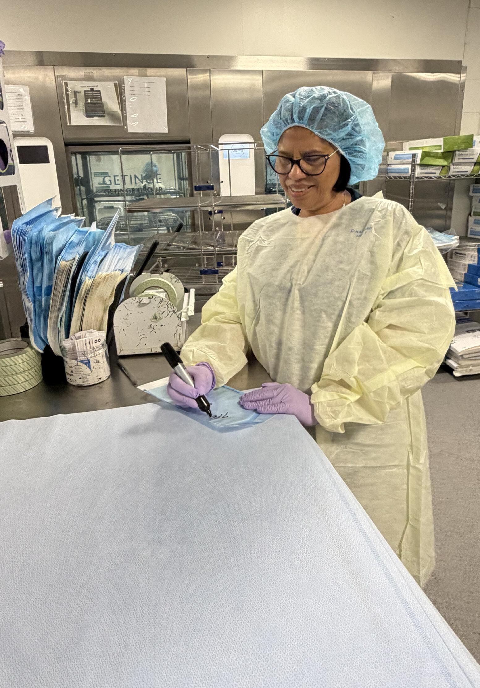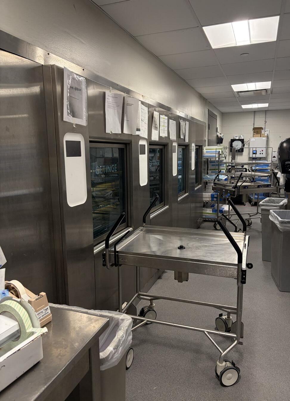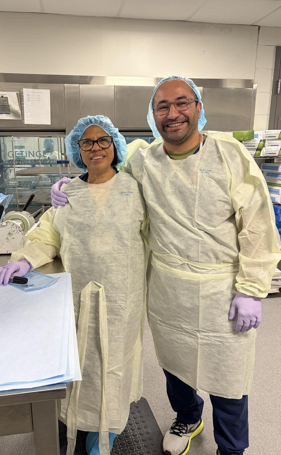 Thisgroup interview with the central sterilization staff revealed just how close and special this team is. Some members have joined recently, while others have been here for many years, yet their respect and camaraderie is unmistakable. Thi linked arms with Mirna as we stood in a circle, taking turns answering my questions about their time on the job. Thi had only started earlier that month, whereas Mirna has been with Boston University for nearly 15 years. Mark and Sayeed described this as a “wonderful place to work” that felt like “family.” As we stood in the basement, the larger-than-life sterilization equipment hummed while completing its cycle. Mirna explained that 2021 facility renovations had particularly affected their department. Central sterilization autoclaves used to be on most clinic floors, but now they have been centralized in the basement, improving efficiency and consolidating maintenance. Mirna added, “The autoclaving machines we used to work with were hard to use. Now we have these enormous machines that work so well; it's really impressive.”