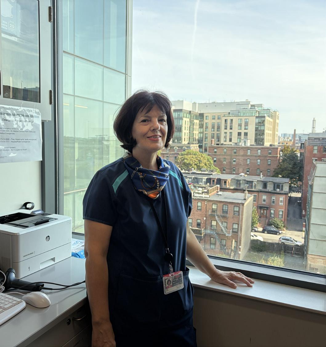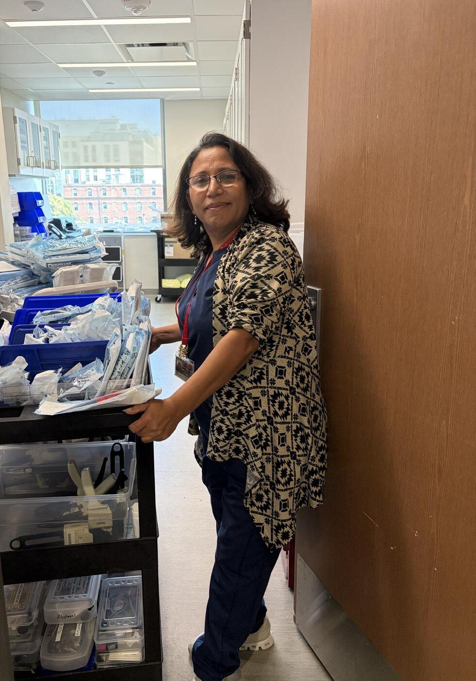 Sylvie, originally from Lyon, France, Sylvie moved to Boston after getting married and now supports dental students as part of the Central Sterilization department. Sylvie said, “My favorite part is meeting people from different backgrounds and cultures.” This interest in cultural exchange extends to her daily work. For example, she described a conversation with her colleague Bharti from Nepal, where Sylvie learned about wedding traditions different from those she knew growing up in an African–French household.