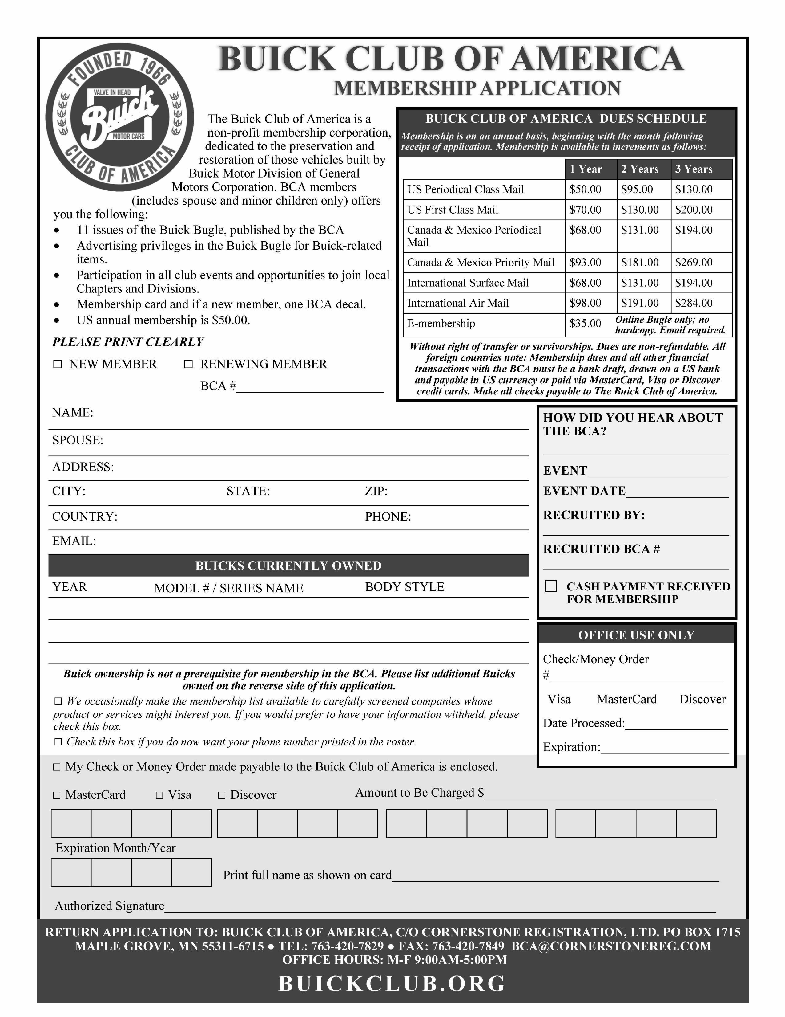For electronic membership application, go to www.buickclub.org and select the Secure Membership link. It will take you to a form where you can enter your personal information and credit card number in a fast, easy and secure way
