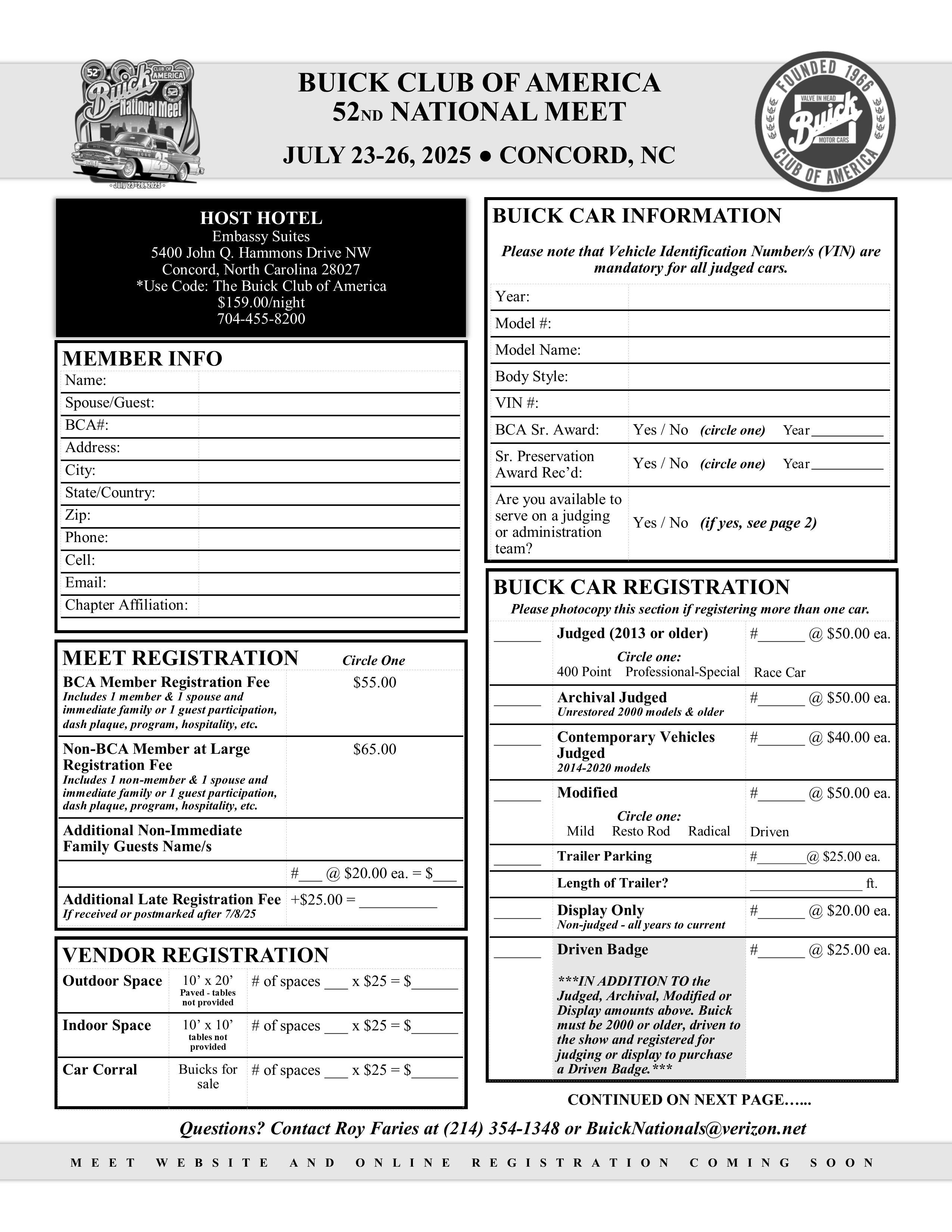 Registration info: Bruce/Shar Kile, BCA #3013, (678) 662-6072, email sbkile58@aol.com or the BDE website bde.buickclub.org.
